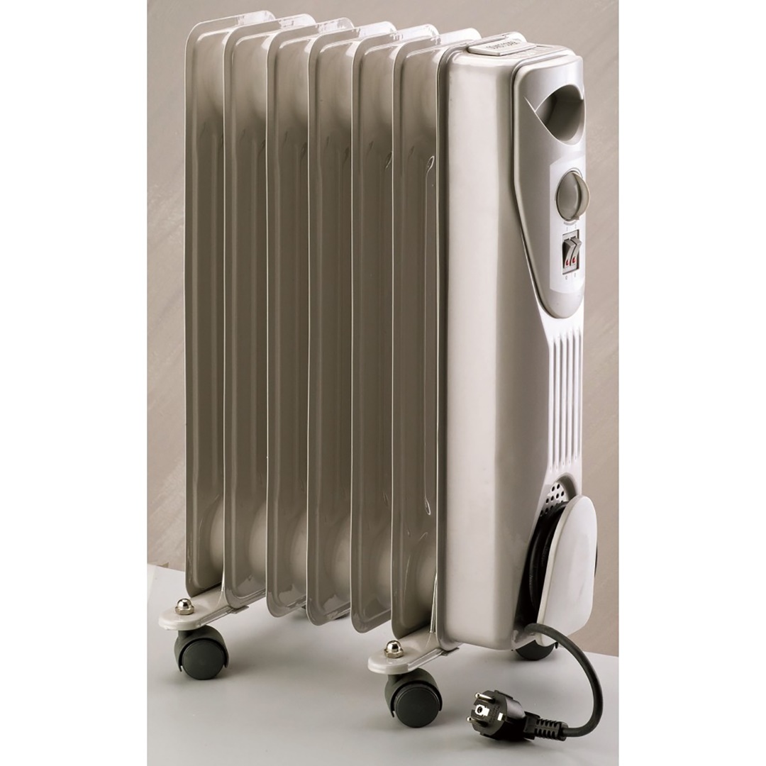 Ηλεκτρικό καλοριφέρ με ορυκτέλαιο και 7 αντιστάσεις από την εταιρεία KEMPER, ιταλικής προέλευσης. Εξοπλισμένο με ρυθμιζόμενο θερμοστάτη για την θέρμανση και διατήρηση της θερμοκρασίας σε ένα δωμάτιο για μεγάλο χρονικό διάστημα. Φωτιζόμενοι διακόπτες για την επιλογή ισχύος, 600W, 900W και 1500 W που την καθιστούν κατάλληλη για κάθε περίσταση. Τροφοδοτείται απο οικιακή πρίζα 230 V / 50Hz και έχει και θερμοστάτη ασφαλείας κατά της υπερθέρμανσης. Μεταφέτεται εύκολα χάρις στα περιστρεφόμενα ροδάκια 360° και την λαβή κατά των εγκαυμάτων που διαθέτει στο μπροστινό μέρος του καλοριφέρ. Πρακτικό στήριγμα περιέλιξης καλωδίου.