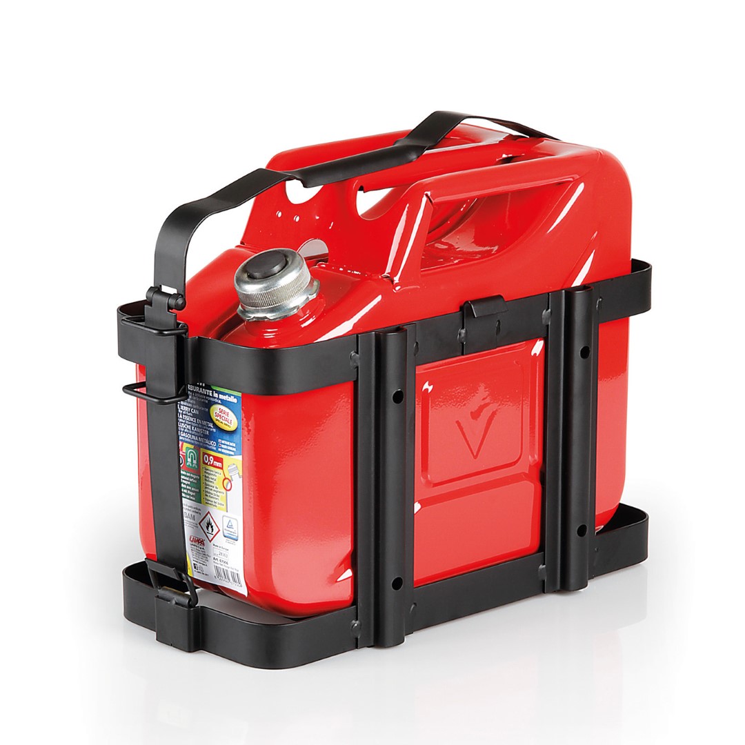 Μεταλλική βάση, κατασκευασμένη από σίδερο σε μαύρο χρώμα, ιταλικής προελεύσεως, κατάλληλη για τοποθέτηση σε οχήματα, που διαθέτουν εξωτερική ρεζέρβα στην πόρτα του πορτ μπαγκάζ τους για την ασφαλή μεταφορά οριζόντιων και κάθετων μεταλλικών κανίστρων (μπετόνια) με χωρητικότητα 10 και 20 λίτρα της LAMPA. Για πρόσθετη ασφάλεια υποστηρίζεται δυνατότητα κλειδώματος με τη χρήση λουκέτου (δεν περιλαμβάνεται). Εύκολη και γρήγορη τοποθέτηση.