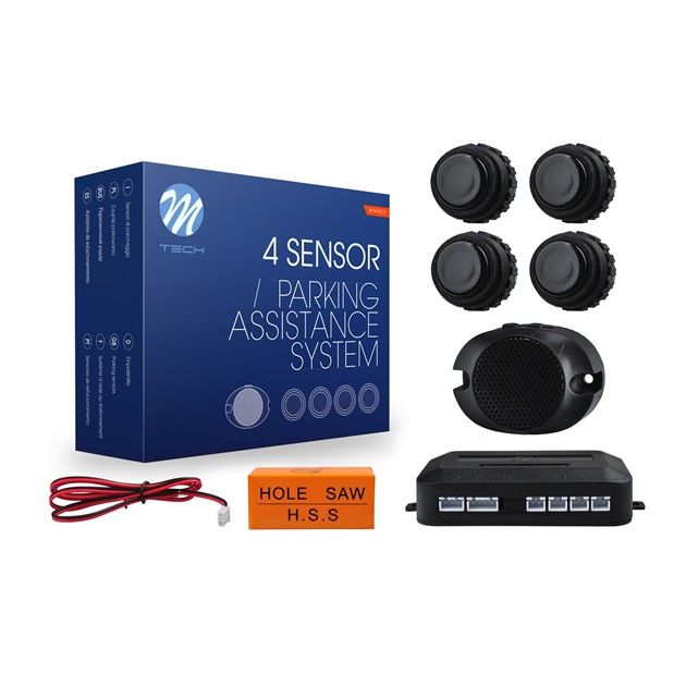 Σύστημα παρκαρίσματος 12v με 4 μαύρους αισθητήρες 22mm και επιπλέον δαχτυλίδι και buzzer, απο την εταιρεία M-TECH, πολωνικής προέλευσης.