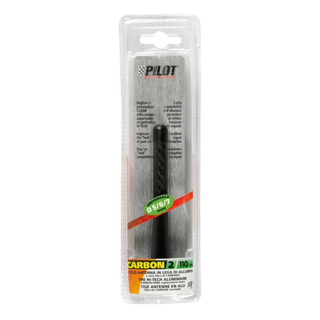 Κεραία οροφής υψηλής τεχνολογίας CARBON-2 από τη LAMPA, ιταλικής προέλευσης, κατασκευασμένη από αλουμίνιο και ανθρακόνημα σε μαύρο χρώμα με carbon λεπτομέρειες και universal εφαρμογή, κατάλληλη για κεραίες με διάμετρο βάσης 5, 6 και 7 mm (περιλαμβάνονται αντάπτορες στη συσκευασία). Το προϊόν έχει μήκος 110 mm και τοποθετείται στην ήδη υπάρχουσα βάση κεραίας, δίνοντας sport αισθητική στο όχημα σας. Εύκολη και γρήγορη τοποθέτηση.