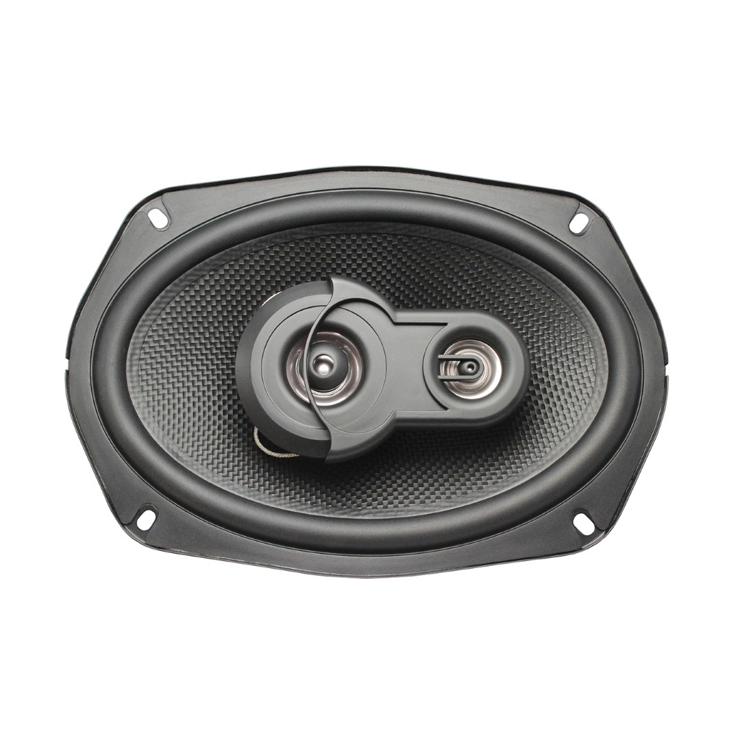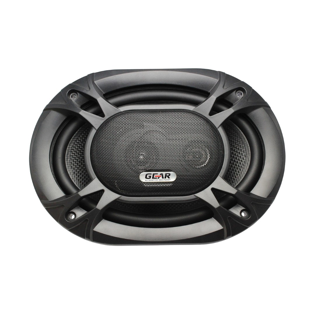 Ηχεία ηχοσυστήματος GR-69F3 από τη GEAR σε μαύρο χρώμα, οβάλ flush mount, τα οποία διαθέτουν 3 δρόμους. Περιλαμβάνουν καλώδια πολλαπλής εισαγωγής για την τοποθέτηση τους.