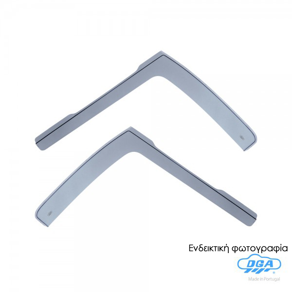 Ανεμοθραύστες παραθύρων από την εταιρία DGA, πορτογαλικής προέλευσης, ειδικά σχεδιασμένοι για να ταιριάζουν ακριβώς στα παράθυρα του αυτοκινήτου σας (μαρκέ προϊόν). " Σκούρα φιμέ απόχρωση, όπου κατά την κατασκευή, ο έλεγχος χρώματος εκτελείται από ηλεκτρονικό φασματοφωτόμετρο για να διασφαλιστεί η ακρίβεια στην αναπαραγωγή του χρώματος. Υλικό: Πιστοποιημένο χυτό ακρυλικό γυαλί ή αλλιώς plexiglas (cast acrylic glass) με υψηλή UV προστασία, το οποίο φέρει έγκριση TÜV – ISO 9001: 2000 and TIS 18001. Εύκαμπτο και πιο ελαφρύ υλικό από το πλαστικό, η σύνθεσή του μένει αναλλοίωτη στον χρόνο, ανθεκτικό στις καιρικές συνθήκες και στις γρατζουνιές. Οι ανεμοθραύστες παραθύρων DGA αποτελούν το ιδανικό αξεσουάρ για την προστασία των επιβατών από την άμεση επαφή τους με τον εισερχόμενο αέρα των παραθύρων κατά την μεταφορά τους. Λόγω του αεροδυναμικού σχεδιασμού τους και της φυσικής κλίσης τους: Απωθούν την βροχή, απομακρύνοντας την, εμποδίζοντας τις σταγόνες να μπουν στην εσωτερική καμπίνα, ακόμη και όταν τα παράθυρα είναι ανοικτά.  Βοηθούν στην μείωση της σκόνης και της βρωμιάς επάνω στα τζάμια, προλαμβάνουν το θάμπωμα των τζαμιών κατά την χειμερινή περίοδο ή τις βροχερές μέρες και επιτρέπουν τον εξαερισμό του εσωτερικού χώρου.  Έχουν τέλεια εφαρμογή με εσοχή στο ύψος του καθρέφτη, χωρίς να εμποδίζουν την ορατότητα.  Οι ανεμοθραύστες DGA τοποθετούνται χωνευτοί μέσα στην υποδοχή του τζαμιού, στην τσιμούχα του παραθύρου, εύκολα και γρήγορα, χωρίς την χρήση εργαλείων ή κλιπ: Με ταινία διπλής όψης 3M, η οποία φέρει εγκρίσεις ISO/TS 16949:2009 και ISO 14001:2004 - περιλαμβάνονται στην συσκευασία. Δεν επηρεάζουν την εύρυθμη λειτουργία του τζαμιού, τον μηχανισμό του παραθύρου ή τις αντιηλιακές μεμβράνες σας (φιλμ παραθύρων) ΣΗΜΕΙΩΣΗ: Για την σωστή επιλογή του κατάλληλου ανεμοθραύστη για το όχημα σας, θα πρέπει να γνωρίζετε με ακρίβεια τη μάρκα, το μοντέλο και τη χρονολογία κατασκευής του ή να κάνετε την αναζήτησή σας με βάση τον αριθμό πλαισίου του αυτοκινήτου, όπως αναγράφεται στην άδεια κυκλοφορίας. Όλα τα αξεσουάρ DGA ελέγχονται διεξοδικά πριν από τη διανομή τους και συμμορφώνονται με όλες τις απαιτήσεις Υγείας, Ασφάλειας και Περιβάλλοντος της ΕΕ. ΠΡΟΣΟΧΗ!! Η φωτογραφία που είναι αναρτημένη ενδέχεται να είναι ενδεικτική, καθώς ο εκάστοτε ανεμοθραύστης είναι σχεδιασμένος αποκλειστικά με βάση τις μετρήσεις του εκάστοτε οχήματος. Eπίσης, ενδέχεται να υπάρχει μικρή απόκλιση στα χρώματα της προεπισκόπησης του προϊόντος, η οποία οφείλεται αποκλειστικά στη διαφοροποίηση της κάθε οθόνης υπολογιστή, laptop, smartphone, tablet ή και άλλης ηλεκτρονικής συσκευής που χρησιμοποιείτε. Συσκευασία 2 τεμαχίων (ζευγάρι).