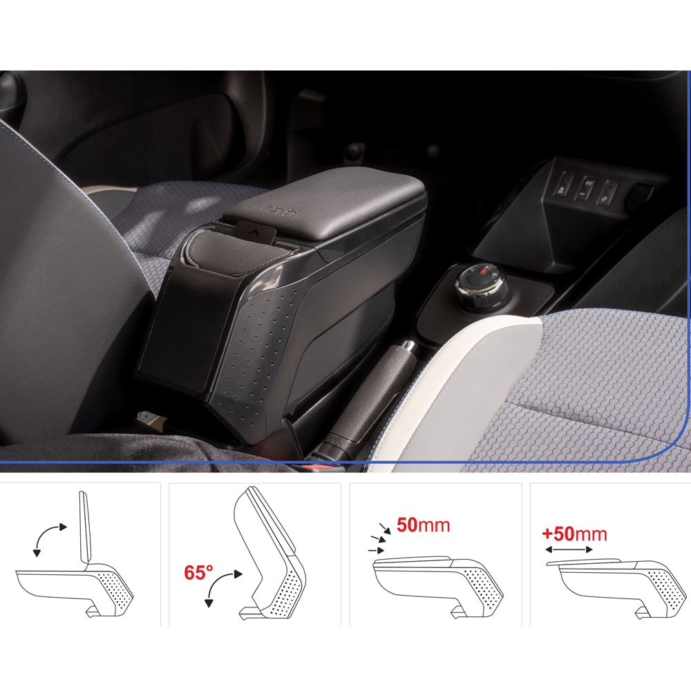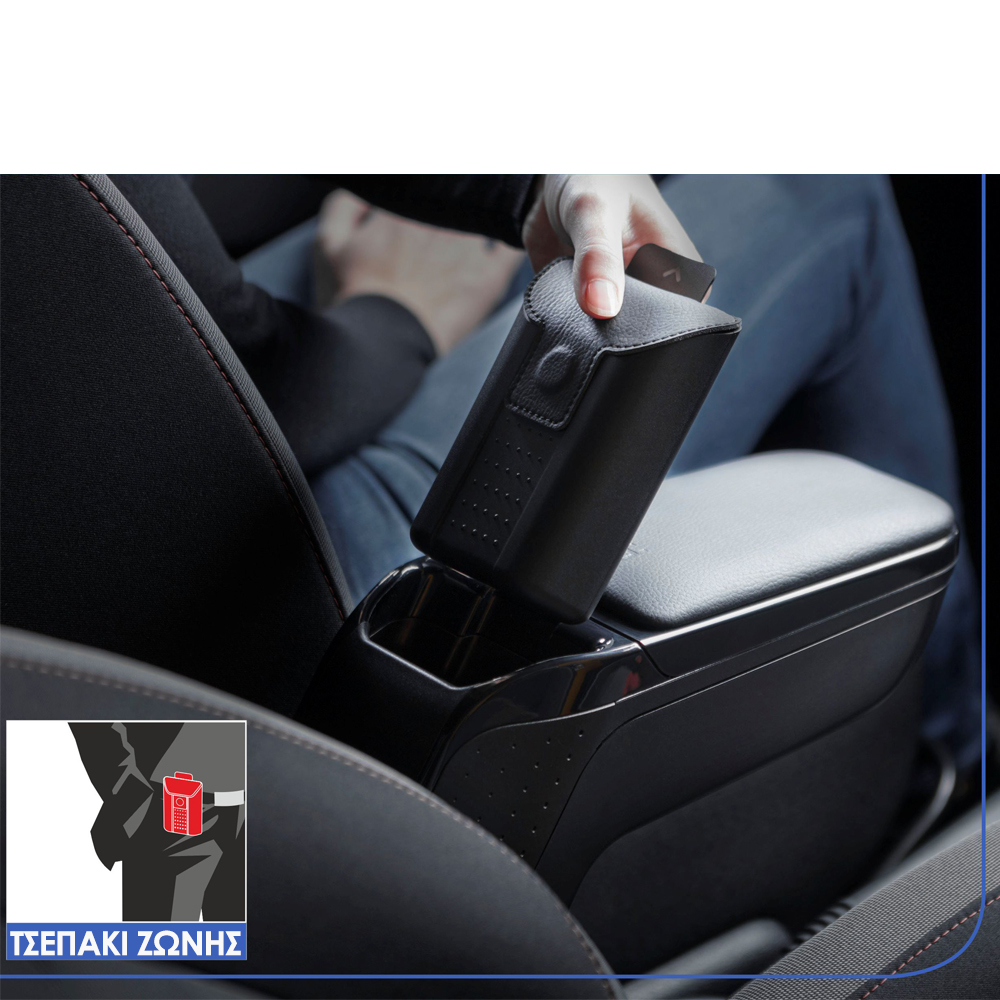 Ο τεμπέλης διαθέτει μηχανισμό ανάκλισης 90 μοιρών για κάθετη ανασήκωση ανάμεσα στα μπροστινά καθίσματα, δυνατότητα ρύθμισης καθ' ύψος αγκώνα με stop 3 θέσεων ανά 5 cm για καλύτερη προσαρμογή και στερέωση σε 3 διαφορετικά σημεία, ευρύ αποθηκευτικό χώρο με ενσωματωμένες θήκες για κέρματα στο πλάι και υποδοχή για στυλό εσωτερικά στο άνω μέρος και συρταρωτό καπάκι που επεκτείνεται έως και 5 cm για μεγαλύτερη επιφάνεια στήριξης. Στο πίσω μέρος της κονσόλας υπάρχει αποσπώμενη φορητή θήκη-τσέπη από μαύρη δερματίνη, που διαθέτει κλιπ για να στερεώνεται σε τσάντες, ζώνη, κτλ. και να μπορείτε να μεταφέρετε όλα όσα χρειάζετστε μαζί σας σε περίπτωση στάσης.