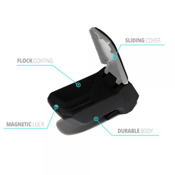 Ολοκληρωμένο σετ κονσόλας χειρόφρενου (τεμπέλης) σε μαύρο χρώμα μαζί με την ειδική βάση τοποθέτησης (μαρκέ αντάπτορας), από την εταιρεία  S-Dizayn, τουρκικής προέλευσης. Υλικό: ABS Πλαστικό σε συνδυασμό με τεχνητό δερμα. Χρώμα: Μαύρο. Βάρος κονσόλας: 2 kg. Με αφρώδη επένδυση στο καπάκι για άνεση. • Το επάνω μέρος μπορεί να χρησιμοποιηθεί ως συρόμενο έως 50mm. • Διαθέτει φορητό μηχανισμό που ανοίγει 90°. • Μαγνητικό κλείδωμα: Ο ισχυρός μαγνήτης δεν επιτρέπει στο καπάκι να ανοίξει εν κινήσει. • Διαθέτει μεγάλο εσωτερικό χώρο για άμεση πρόσβαση σε μικροπράγματα και προσωπικά αντικείμενα, χρήματα, κινητό τηλέφωνο, κλειδιά, κτλ     Συσκευασία 1 τεμαχίου