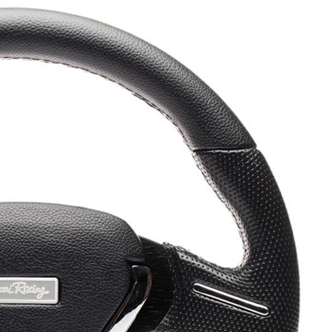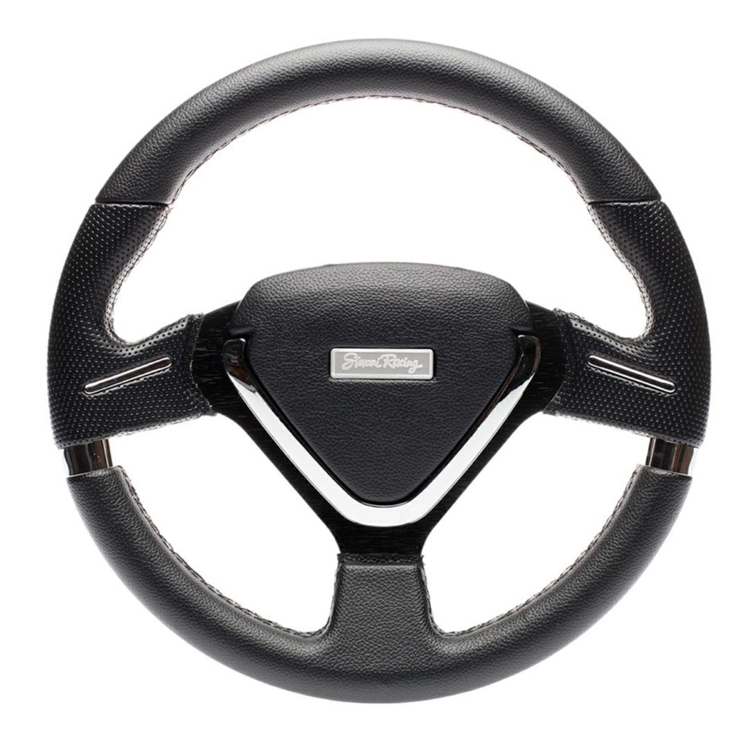 Τιμόνι αυτοκινήτου από την εταιρία SIMONI RACING, ιταλικής προελεύσεως σε μαύρο χρώμα με διακοσμητικές λεπτομέρειες και δακτυλίδια χρωμίου, κατασκευασμένο από οικολογική δερματίνη (eco leather). Διαθέτει λαβή πλάτους 10,4 cm με υφή και αίσθηση μαλακής διάτρητης, πορώδους δερματίνης, 3 μεταλλικές ακτίνες (μπράτσα) και καπάκι κόρνας με κεντρική διακοσμητική πλακέτα σκαλισμένη με logo. Έχει universal εφαρμογή, για να ταιριάζει στα περισσότερα μοντέλα αυτοκινήτων και προσφέρει ασφαλές, άνετο κράτημα, προσδίδοντας παράλληλα μία μοναδική κομψότητα στο εσωτερικό του οχήματος χάρις στο πολυτελές design του και τον minimal σχεδιασμό του. Εύκολη και γρήγορη τοποθέτηση.