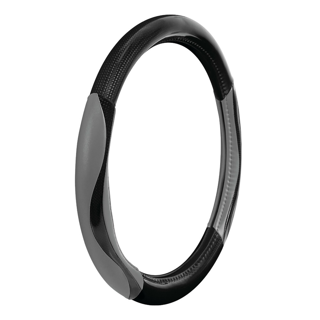 Κάλυμμα τιμονιού ιταλικής προέλευσης της σειράς Silverstone, από την εταιρία Lampa. Κατασκευασμένο από εξαιρετικής ποιότητας και αντοχής δερματίνη από υλικό φιλικό στο περιβάλλον, άοσμο, οικολογικό και μη τοξικό. Διαθέτει carbon σχεδιασμό περιμετρικά και λαβή (δεξιά-αριστερά) σε μαύρο/γκρι χρώμα. Ιδανικό κάλυμμα για οχήματα με διάμετρο τιμονιού 37/39 cm και κατάλληλο για όλες τις καιρικές συνθήκες.