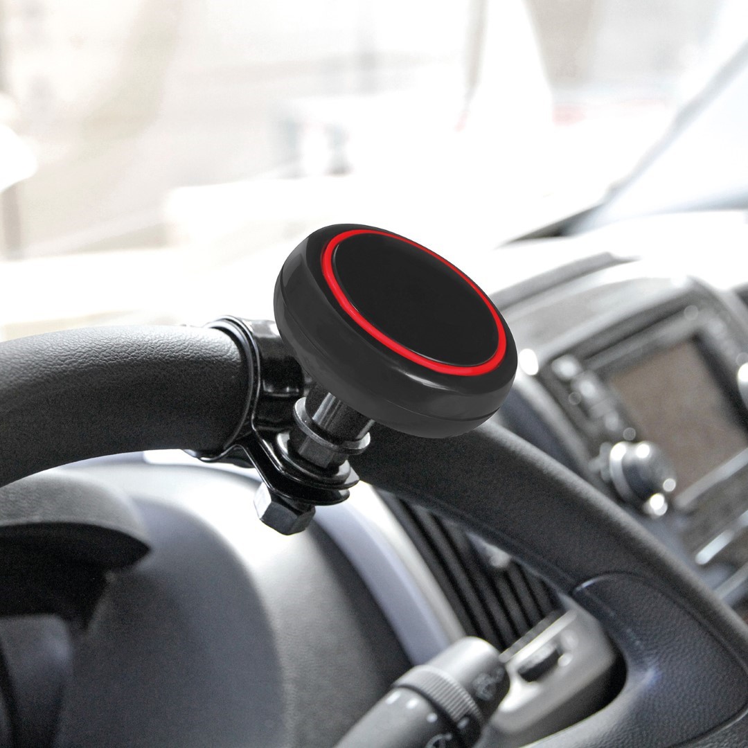 Τεμπέλης τιμονιού με διάμετρο 60 mm, εξοπλισμένος με στρογγυλή πλακέ λαβή σε μαύρο χρώμα και κόκκινη ρίγα στο κέντρο ως λεπτομέρεια για καλύτερο και άνετο κράτημα ή χειρισμό του τιμονιού κατά τη διάρκεια οδήγησης. Ο σφιχτήρας (λαβή) του τεμπέλη SPINNY LINE είναι ρυθμιζόμενος για να αυξομειώνεται και διαθέτει αντιολισθητική επιφάνεια στην εσωτερική του πλευρά για να σταθεροποιείται καλύτερα το προϊόν επάνω στο τιμόνι και να μην γλιστράει. Κομψό και ιδιαίτερο design για να ταιριάζει σε εσωτερικές καμπίνες οχημάτων για sport αισθητική. Universal εφαρμογή για να ταιριάζει σε τιμόνια αυτοκινήτου, φορτηγού, κ.ά. με πάχος λαβής από 30 έως 37 mm.