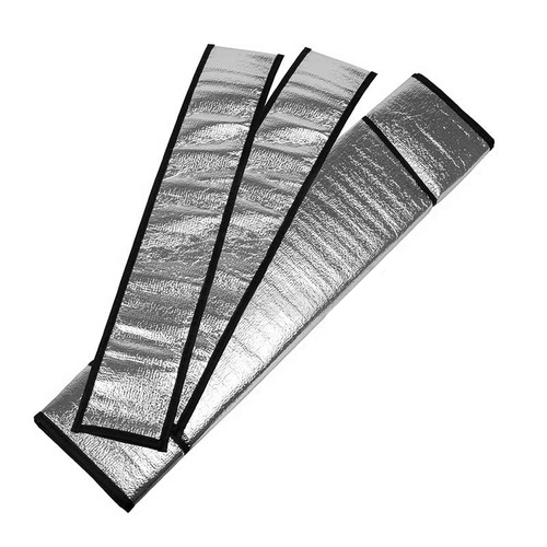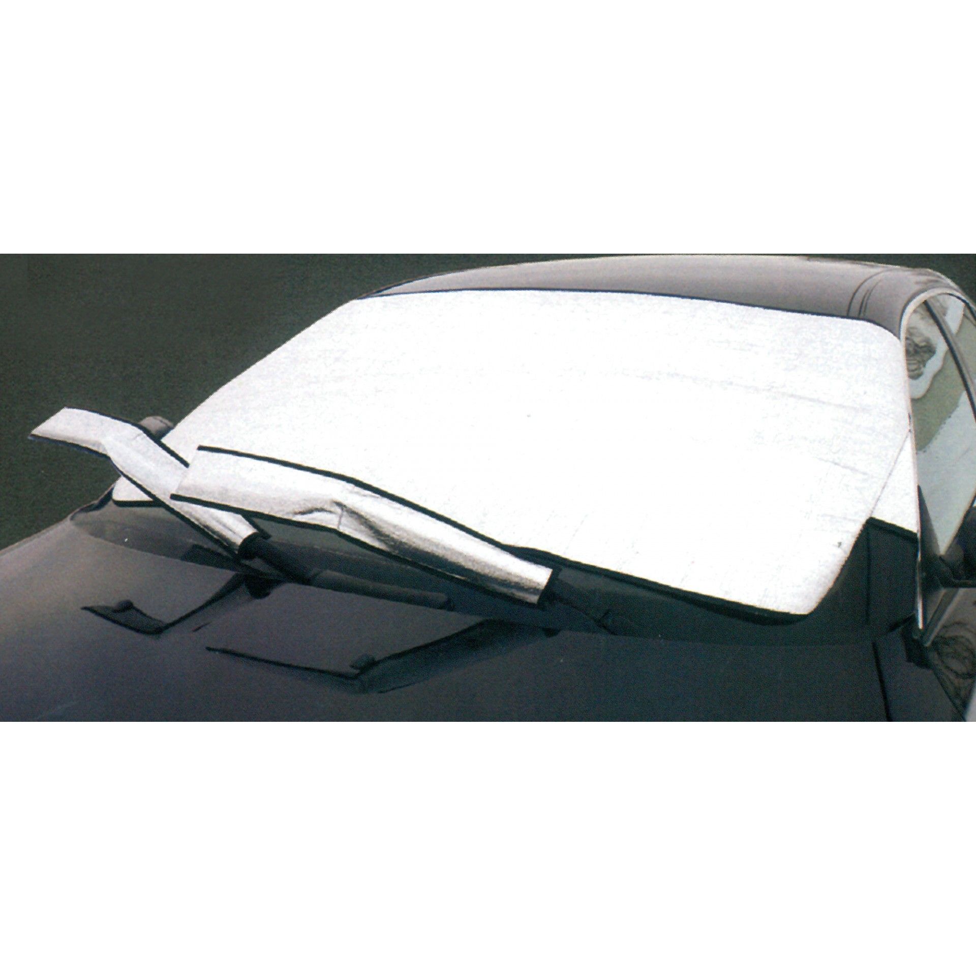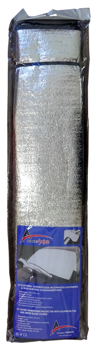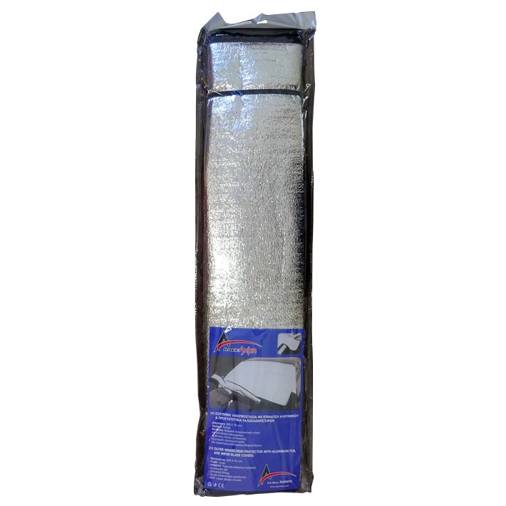Ηλιοπροστασία αυτοκινήτου, κατασκευασμένη από θερμικό ανακλαστικό υλικό κι ενισχυμένη με επένδυση αλουμινίου σε ασημί χρώμα, η οποία τοποθετείται εξωτερικά από το παρμπρίζ του οχήματος. Universal εφαρμογή για να ταιριάζει στα περισσότερα αυτοκίνητα, ιδανική για να διατηρεί δροσερό το εσωτερικό της καμπίνας και παράλληλα να το προστατεύει πλήρως από διάβρωση, σπασίματα ή φθορές που προκαλούν οι ακτίνες του ηλίου στα πλαστικά μέρη και στα καθίσματα. Διαθέτει πρόσθετες προστατευτικές θήκες, ενισχυμένες κι αυτές με επένδυση αλουμινίου, οι οποίες τοποθετούνται φορετά για να προστατεύονται οι υαλοκαθαριστήρες και τα λάστιχά τους από τις υψηλές θερμοκρασίες. Εύκολη και γρήγορη τοποθέτηση στο παρμπρίζ, στερεώνοντας τα πλευρικά πτερύγια στο εσωτερικό, όταν κλείνετε τις πόρτες του αυτοκινήτου.