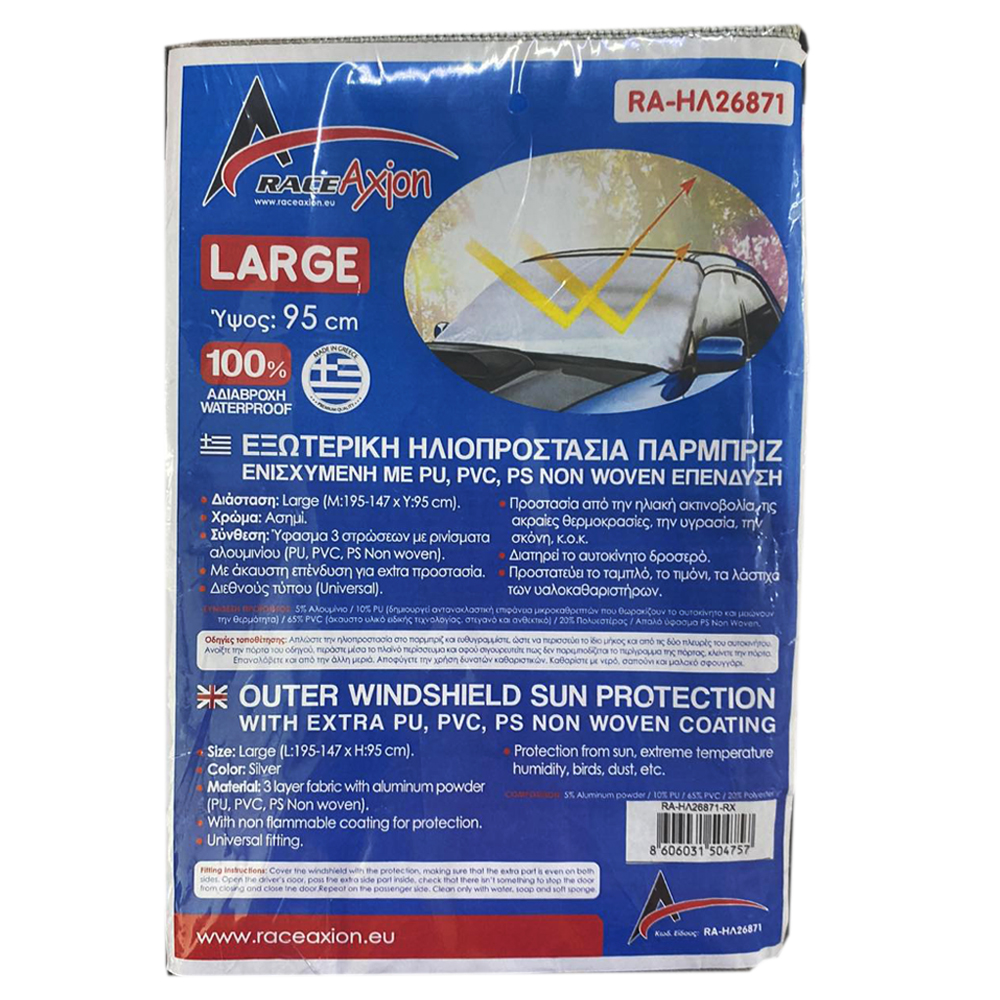 Εξωτερική Ηλιοπροστασία Large Μ195-147 Χ Υ95 cm για το Παρμπρίζ από Ύφασμα 3 Στρώσεων και Ρινίσματα Αλουμινίου σε ασημί χρώμα με logo και άκαυστη επένδυση Race Axion - 1 τεμάχιο "