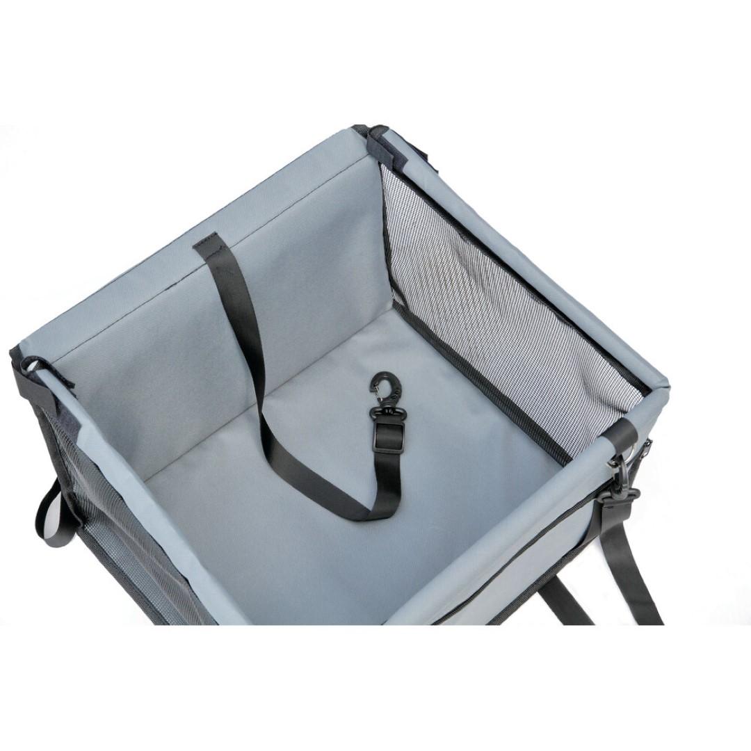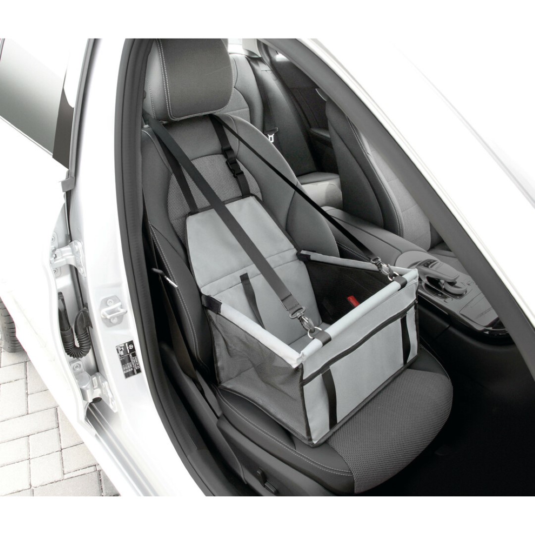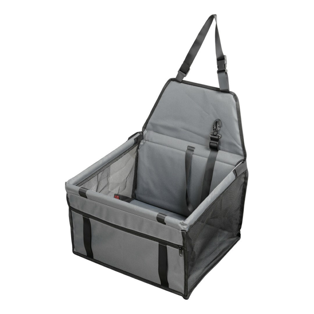 Ειδικό κάθισμα (κουτί) αυτοκινήτου για την μεταφορά κατοικίδιου ζώου (σκύλου, γάτας), ιδανικό για εφαρμογή στο εμπρός κάθισμα αλλά και για τα πίσω. Διαθέτει λουρί με γάντζο για να μπορείτε να δέσετε το ζώο από το κολάρο. Έχει υφασμάτινο ιμάντα με κλιπ και ένα μεγάλο εμπρός για να στηρίζεται το κουτί με ασφάλεια, κατά την διαδρομή, στο προσκέφαλο του καθίσματος. Μπορεί να πλυθεί με νερό και βούρτσα. Ιδανική λύση για να έχουν οι μικροί μας φίλοι το δικό τους προσωπικό χώρο στο οικογενειακό αυτοκίνητο, χωρίς να λερώνουν το κάθισμα από πατημασιές και τις τρίχες. Κάντε ένα άνετο ταξίδι απολαμβάνοντας την διαδρομή χωρίς να παρεμποδίζεται ο οδηγός από τα χάδια του μικρού σας φίλου.