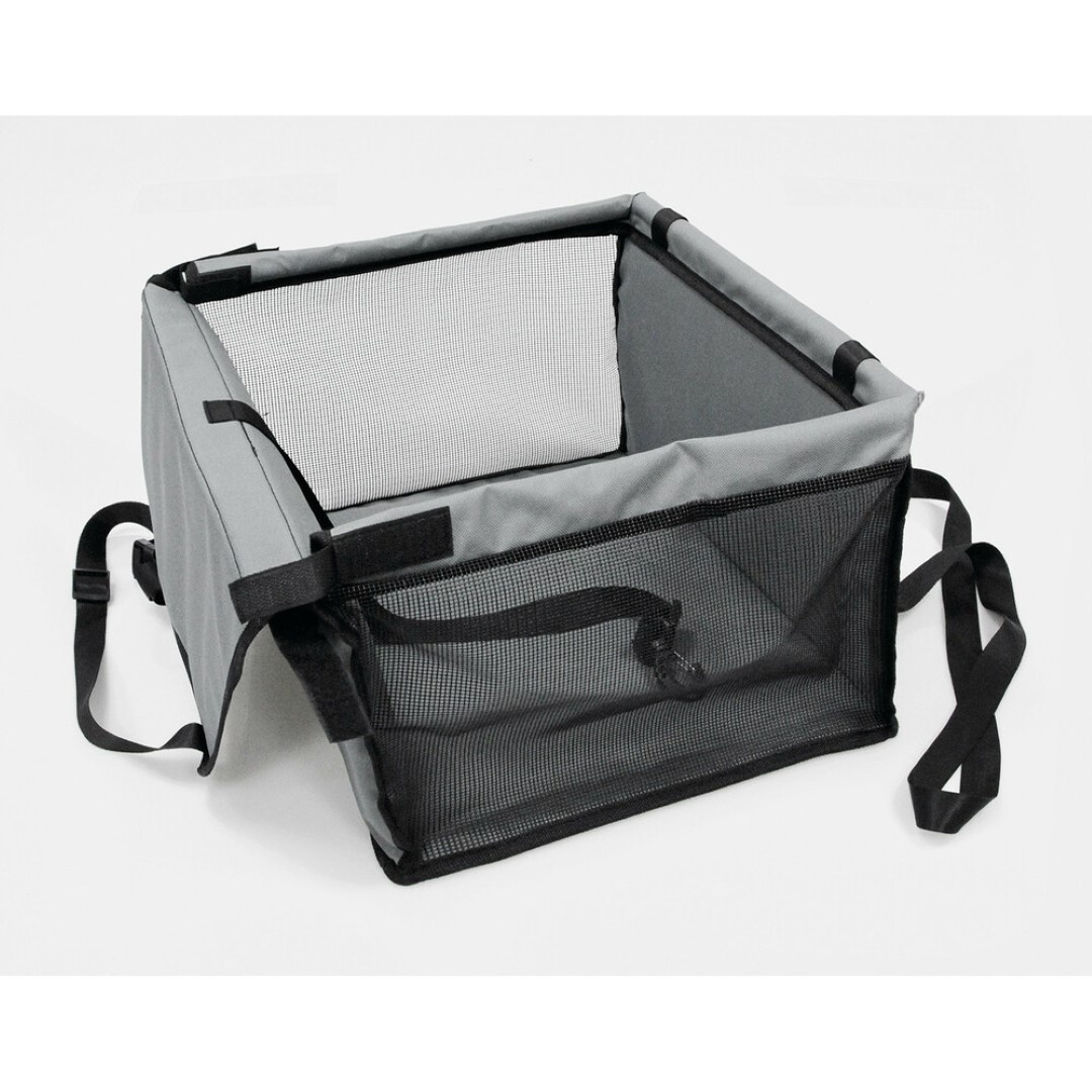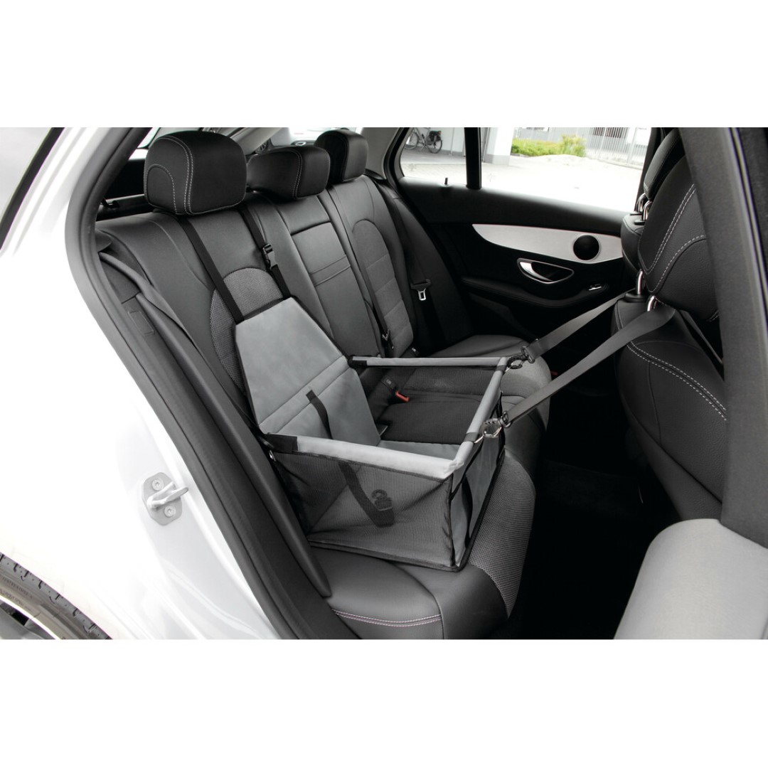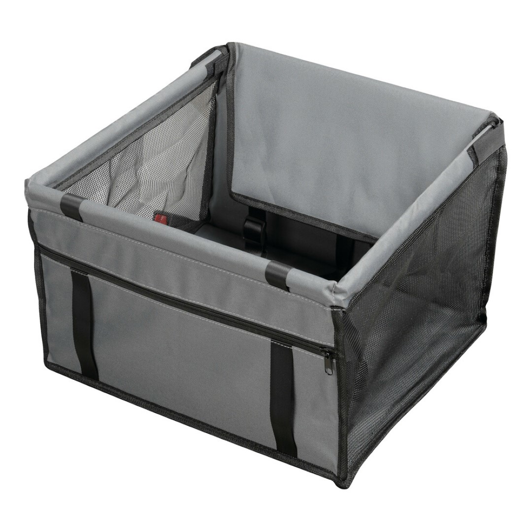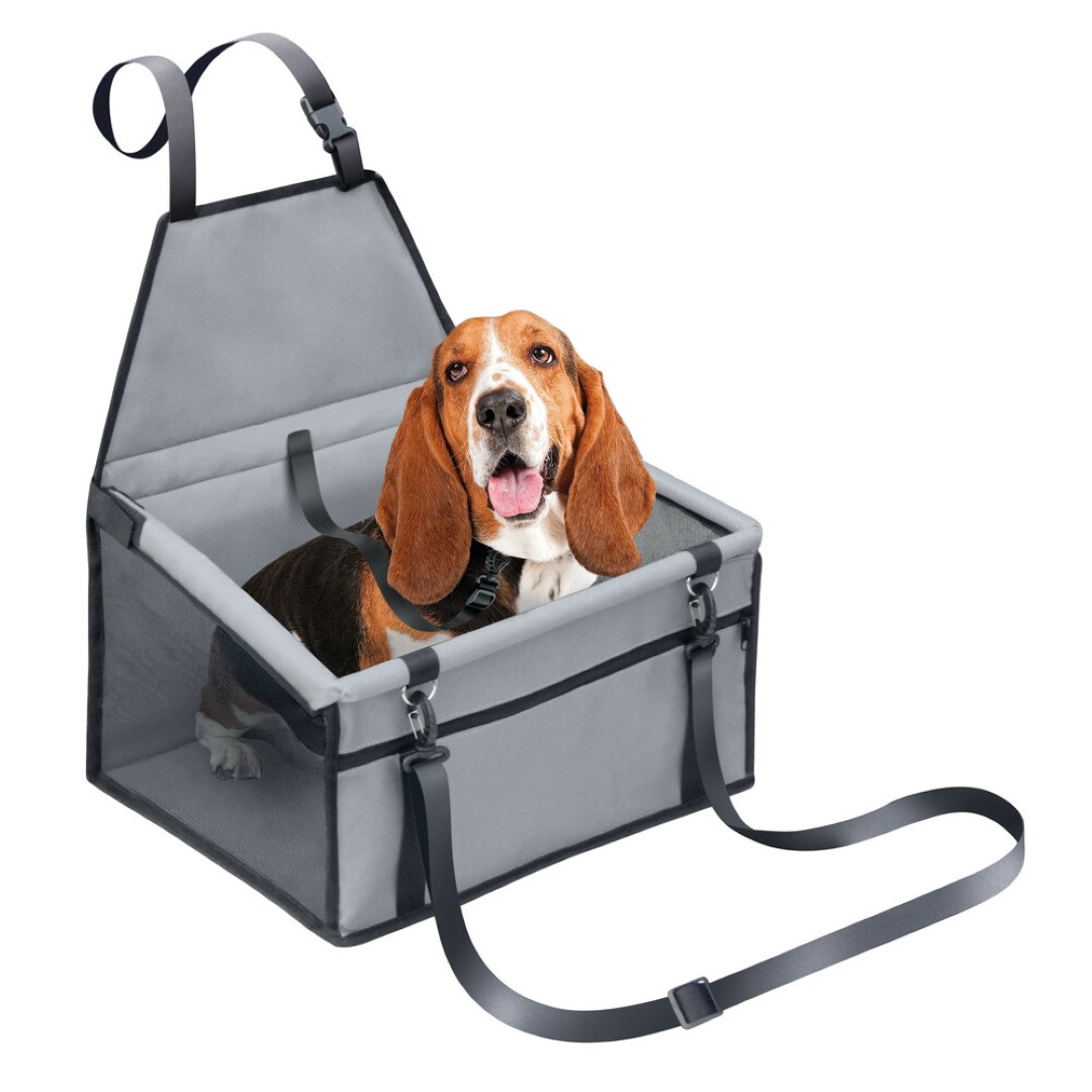 Ειδικό κάθισμα (κουτί) αυτοκινήτου για την μεταφορά κατοικίδιου ζώου (σκύλου, γάτας), ιδανικό για εφαρμογή στο εμπρός κάθισμα αλλά και για τα πίσω. Διαθέτει λουρί με γάντζο για να μπορείτε να δέσετε το ζώο από το κολάρο. Έχει υφασμάτινο ιμάντα με κλιπ και ένα μεγάλο εμπρός για να στηρίζεται το κουτί με ασφάλεια, κατά την διαδρομή, στο προσκέφαλο του καθίσματος. Μπορεί να πλυθεί με νερό και βούρτσα. Ιδανική λύση για να έχουν οι μικροί μας φίλοι το δικό τους προσωπικό χώρο στο οικογενειακό αυτοκίνητο, χωρίς να λερώνουν το κάθισμα από πατημασιές και τις τρίχες. Κάντε ένα άνετο ταξίδι απολαμβάνοντας την διαδρομή χωρίς να παρεμποδίζεται ο οδηγός από τα χάδια του μικρού σας φίλου.