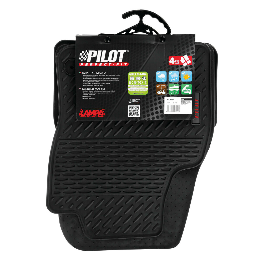 Πατάκια αυτοκινήτου από την εταιρία LAMPA, ιταλικής προέλευσης, κατασκευασμένα από υψηλής ποιότητας άοσμο λάστιχο, το οποίο είναι εξαιρετικής αντοχής, σχεδιασμένα για να ταιριάζουν ακριβώς στις διαστάσεις του δαπέδου του εκάστοτε οχήματος (μαρκέ). Διαθέτουν αντιολισθητικό πάτο για να παραμένουν σταθερά χωρίς να μετακινούνται κατά την είσοδο και έξοδο από το όχημα. Κατάλληλο αξεσουάρ αυτοκινήτου για όλες τις εποχές, ανθεκτικά στο πέρας του χρόνου, παρέχουν προστασία από βρωμιά, σκόνη, λάσπες και υγρασία. Πλένονται και καθαρίζονται πολύ εύκολα, διατηρώντας το αρχικό τους σχήμα. Διαθέτουν κουμπώματα (fixing buttons) για καλύτερη σταθερότητα και πρόσφυση στο δάπεδο. Εύκολη και γρήγορη τοποθέτηση.