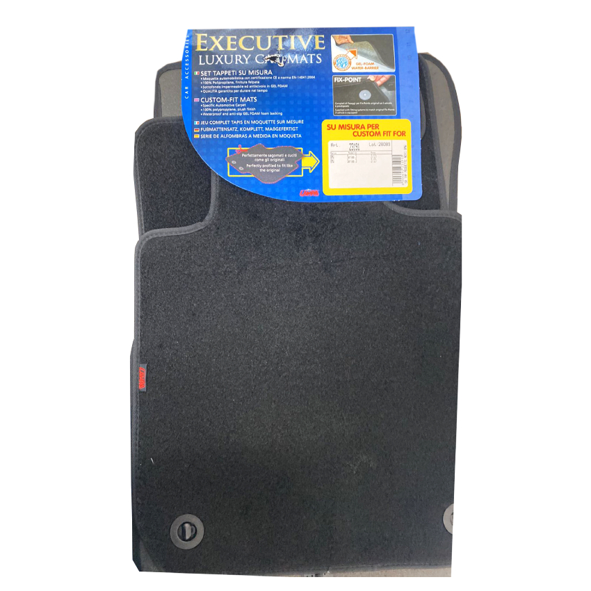 Πατάκια αυτοκινήτου από την εταιρία LAMPA, ιταλικής προέλευσης, κατασκευασμένα από υψηλής ποιότητας μοκέτα - 100% πολυπροπυλένιο - σε μαύρο χρώμα με περιμετρικό φινίρισμα από βελούρ ρέλι (απομίμηση βελούδου), σχεδιασμένα για να ταιριάζουν ακριβώς στις διαστάσεις του δαπέδου του εκάστοτε οχήματος - μαρκέ προϊόν. Είναι αδιάβροχα και διαθέτουν αντιολισθητικό πάτο ενισχυμένο με gel στο πίσω μέρος τους για καλύτερη πρόσφυση στο δάπεδο, καθώς και κουμπιά στερέωσης fix-points για όσα οχήματα είναι εξοπλισμένα με αντίστοιχες εργοστασιακές υποδοχές για να παραμένουν σταθερά στο πάτωμα της καμπίνας κατά την είσοδο/έξοδο των επιβατών. - Χρώμα: Μαύρο. - Υλικό: Μοκέτα με βελούδινο φινίρισμα. - Περιλαμβάνει: Fix points (κουμπιά στερέωσης) - αν διαθέτει το αυτοκίνητο. - Μαρκέ πατάκια αυτοκινήτου. - Αδιάβροχα με αντιολισθητικο gel foam στο πίσω μέρος. - Εύκολη και γρήγορη τοποθέτηση. *ΠΡΟΣΟΧΗ!! Η φωτογραφία ενδέχεται να είναι ενδεικτική, καθώς το σχέδιο/μοτίβο (pattern) σε κάθε πατάκι μπορεί να διαφέρει ανάλογα τις μετρήσεις του εκάστοτε οχήματος. Eπίσης, ενδέχεται να υπάρχει μικρή απόκλιση στα χρώματα της προεπισκόπησης του προϊόντος, η οποία οφείλεται αποκλειστικά στη διαφοροποίηση της κάθε οθόνης υπολογιστή, laptop, smartphone, tablet ή και άλλης ηλεκτρονικής συσκευής που χρησιμοποιείτε. Συσκευασία 4 τεμαχίων.