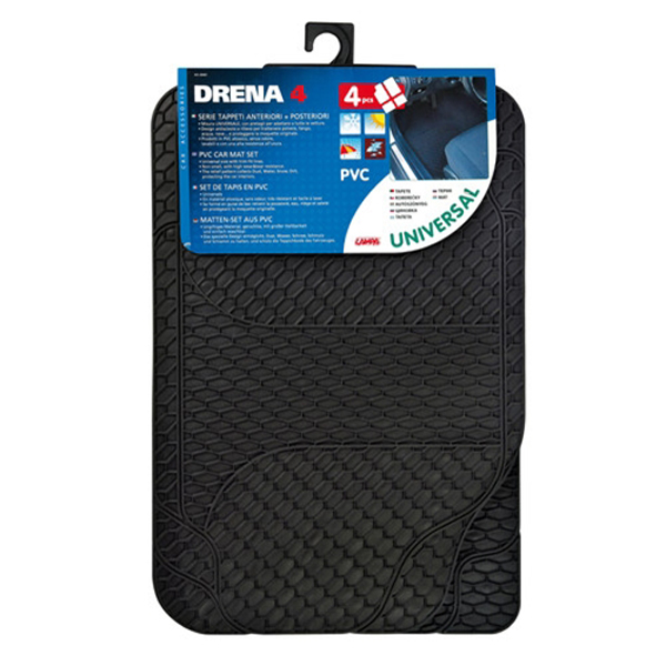 Πατάκια DRENA-4, ιταλικής προέλευσης από την εταιρία Lampa. Ειδικά κατασκευασμένα από PVC για προστασία του δαπέδου της εσωτερικής καμπίνας του οχήματός σας. Ανθεκτικά στο υγρό στοιχείο (λάσπη, νερό, χιόνι κ.α). Είναι άοσμα και μπορούν να κοπούν με ψαλίδι (διαθέτει οδηγούς-αυλάκια) δίνοντάς τους το σχήμα που έχει το δάπεδο του οχήματός σας. Κατάλληλο για τα περισσότερα οχήματα.