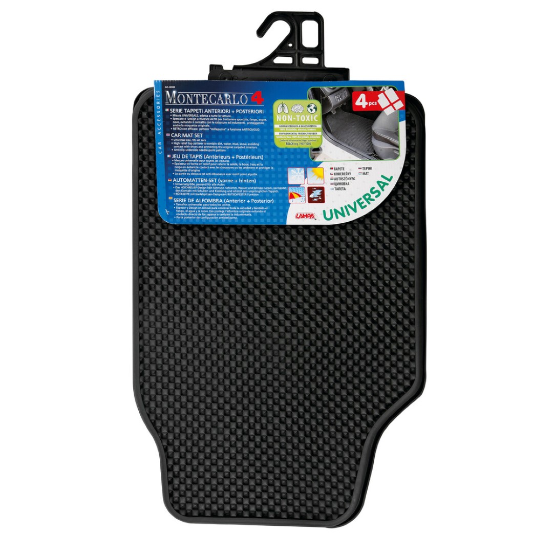 Πατάκια λάστιχο Montecarlo-4, κατασκευασμένα από άοσμο, οικολογικό λάστιχο, φιλικό προς το περιβάλλον με βάση από 100% συνθετικό ανακυκλώσιμο υλικό, ιταλικής προέλευσης από την εταιρία Lampa. Ιδανικά πατάκια για προστασία δαπέδου της εσωτερικής καμπίνας του οχήματός σας από νερό, λάσπη, σκόνη κ.α ή για να προστατεύσετε τις ήδη υπάρχουσες μοκέτες από την τριβή του παπουτσιού, βάζοντας τα πατάκια λάστιχο Montecarlo από πάνω. Είναι αντιολισθητικά στην πίσω πλευρά τους για καλύτερη σταθερότητα κατά την εφαρμογή. Κατάλληλα για την τοποθέτησή τους στα περισσότερα αυτοκίνητα.