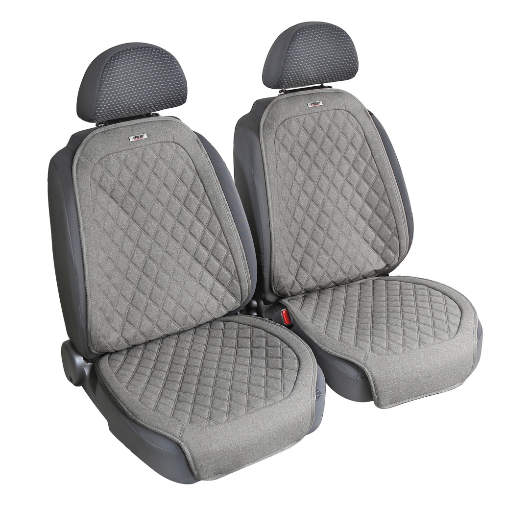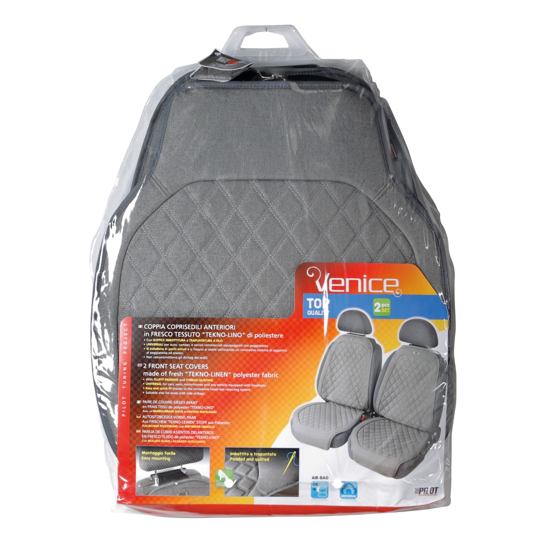 Πλατοκαθίσματα VENICE από την εταιρία Lampa, ιταλικής προέλευσης, για τοποθέτηση στο επάνω μέρος των καθισμάτων του οχήματός σας, κατάλληλα για προστασία κατά της φθοράς που προκαλείται από σκόνη, ξεθώριασμα από τις αχτίδες ήλιου, την καθημερινή τριβή/χρήση, τυχόν λεκέδες από ρόφημα, φαγητό, κτλ. καθώς επίσης και για την εσωτερική διακόσμηση της καμπίνας του αυτοκινήτου. Κατασκευασμένα από εξαιρετικής ποιότητας λινό πολυεστερικό ύφασμα σε μαύρο χρώμα και καπιτονέ σχέδιο, ενισχυμένα με επένδυση από αφρώδη μαξιλαράκια προσφέροντας άνεση κατά την διάρκεια της οδήγησης ή του ταξιδιού. Το πλάτος τους είναι ιδιαιτέρως φαρδύ για να ταιριάζουν άριστα στα περισσότερα καθίσματα αυτοκινήτων (universal εφαρμογή). Εύκολη και γρήγορη τοποθέτηση με ειδικό δέσιμο στα προσκέφαλα των καθισμάτων για σταθερότητα κατά την εφαρμογή τους. Συμβατά και με καθίσματα που διαθέτουν πλευρικούς αερόσακους (airbags).