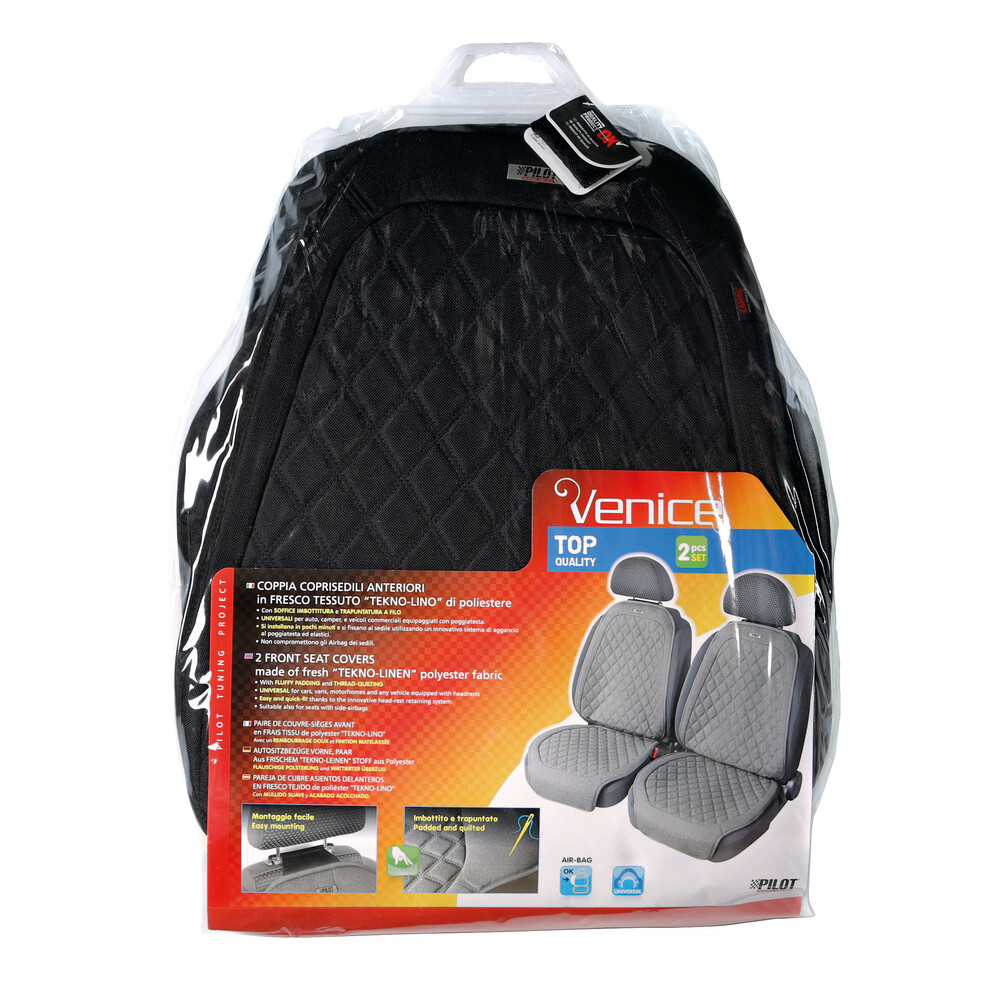 Πλατοκαθίσματα VENICE από την εταιρία Lampa, ιταλικής προέλευσης, για τοποθέτηση στο επάνω μέρος των καθισμάτων του οχήματός σας, κατάλληλα για προστασία κατά της φθοράς που προκαλείται από σκόνη, ξεθώριασμα από τις αχτίδες ήλιου, την καθημερινή τριβή/χρήση, τυχόν λεκέδες από ρόφημα, φαγητό, κτλ. καθώς επίσης και για την εσωτερική διακόσμηση της καμπίνας του αυτοκινήτου. Κατασκευασμένα από εξαιρετικής ποιότητας λινό πολυεστερικό ύφασμα σε μαύρο χρώμα και καπιτονέ σχέδιο, ενισχυμένα με επένδυση από αφρώδη μαξιλαράκια προσφέροντας άνεση κατά την διάρκεια της οδήγησης ή του ταξιδιού. Το πλάτος τους είναι ιδιαιτέρως φαρδύ για να ταιριάζουν άριστα στα περισσότερα καθίσματα αυτοκινήτων (universal εφαρμογή). Εύκολη και γρήγορη τοποθέτηση με ειδικό δέσιμο στα προσκέφαλα των καθισμάτων για σταθερότητα κατά την εφαρμογή τους. Συμβατά και με καθίσματα που διαθέτουν πλευρικούς αερόσακους (airbags).
