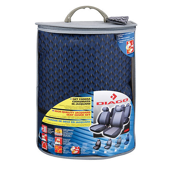 Καλύμματα καθισμάτων Diago (Μπλε). Αποτελείται από 2 μπροστινά και 2 πισινά καλύμματα με 5 προσκέφαλα. Κάνει και για οχήματα με αερόσακο.