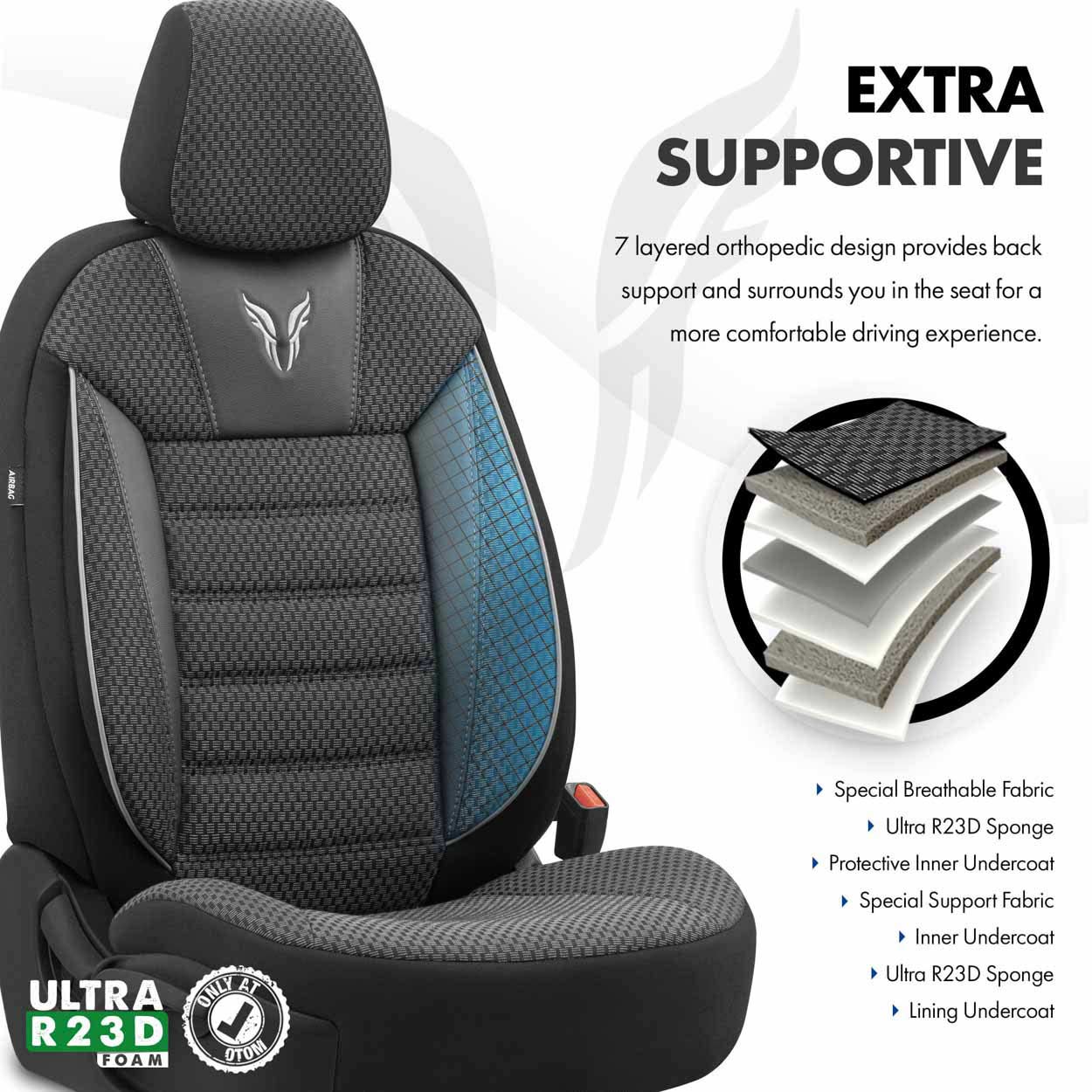 Το προϊόν είναι κατασκευασμένο από υφάσματα ταπετσαρίας υψηλής ποιότητας. Ο συνδυασμός των καλύτερων υλικών και η μεγάλη προσοχή στη λεπτομέρεια κατά την παραγωγή εξασφαλίζει αποκλειστική εμφάνιση και εξαιρετική αντοχή, καθώς και εξαιρετική προστασία των καθισμάτων από βρωμιά και τριβή.