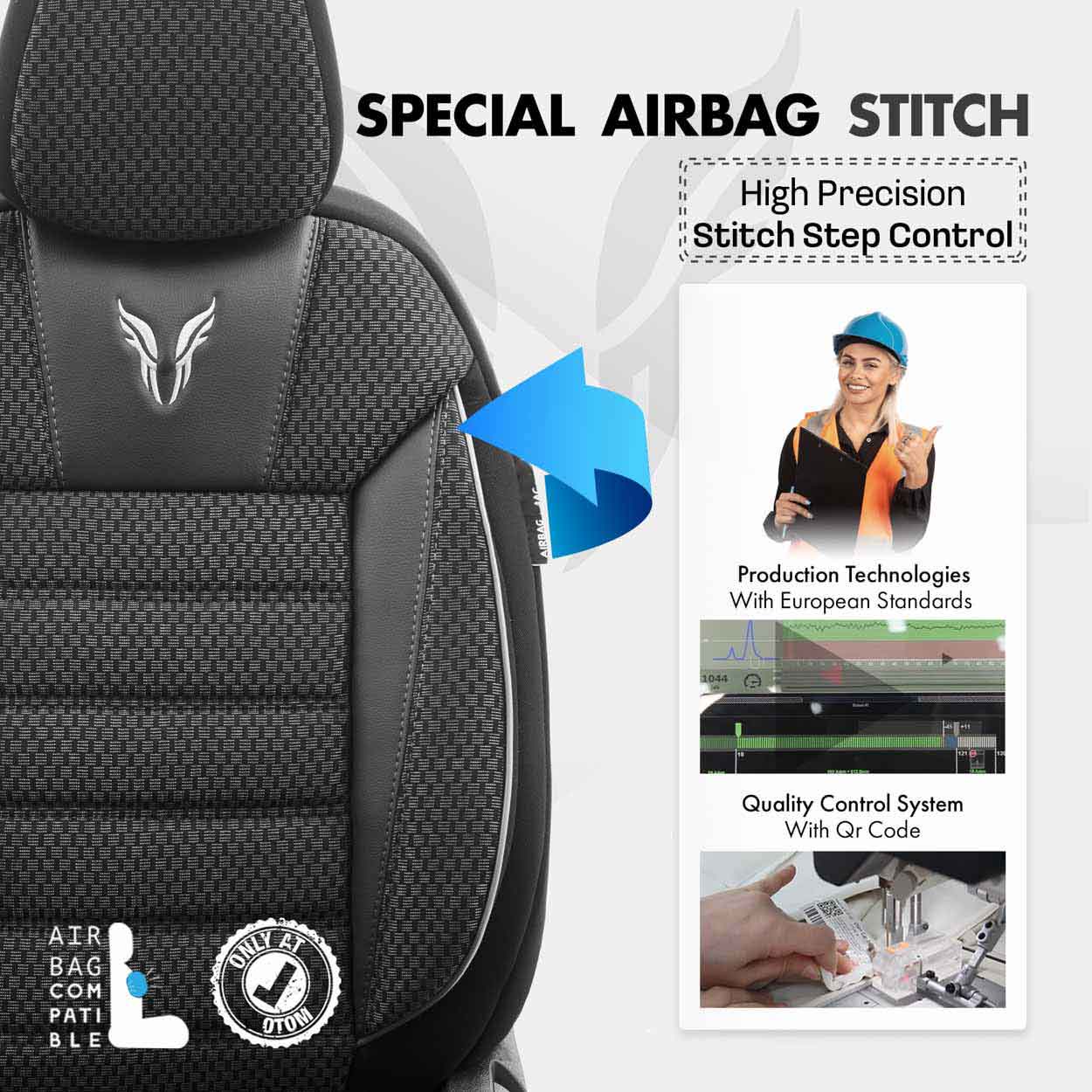 Τα καλύμματα διαθέτουν πιστοποιημένη ραφή AIRBAG, καθιστώντας τα κατάλληλα για αυτοκίνητα με πλευρικούς αερόσακους στα καθίσματα καθώς και για τυπικά καθίσματα. Χάρη στη χρήση ειδικής ραφής, καλύπτουν πλήρως τα καθίσματα χωρίς να διαταράσσουν τη λειτουργία των αερόσακων.