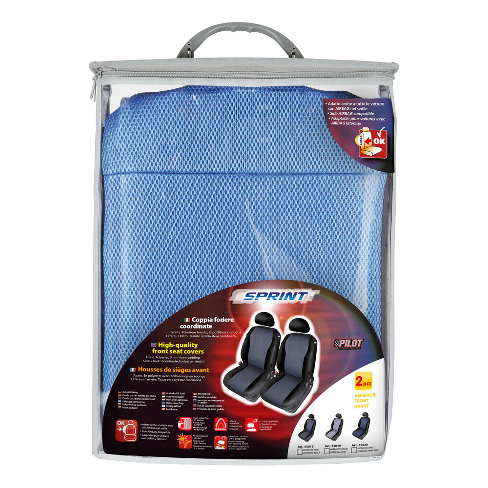 Καλύμματα για τα εμπρός καθίσματα του αυτοκινήτου Sprint, κατασκευασμένα από πολυεστερικό ύφασμα, ιταλικής προέλευσης από την εταιρία Lampa. Προσαρμόζεται σε όλα τα κανονικά καθίσματα, με ή χωρίς πλευρικούς αερόσακους (airbags). Τα καλύμματα της σειράς Sprint διαθέτουν υποδοχή για να μπαίνουν τα προσκέφαλα του καθίσματος απευθείας. Ιδανική λύση για να διακοσμήσετε την εσωτερική καμπίνα του οχήματός σας, να προστατεύσετε τα καθίσματά σας ή να τα καλύψετε από φθορές που έχουν προκληθεί από τριβή, ξεθώριασμα κ.α.