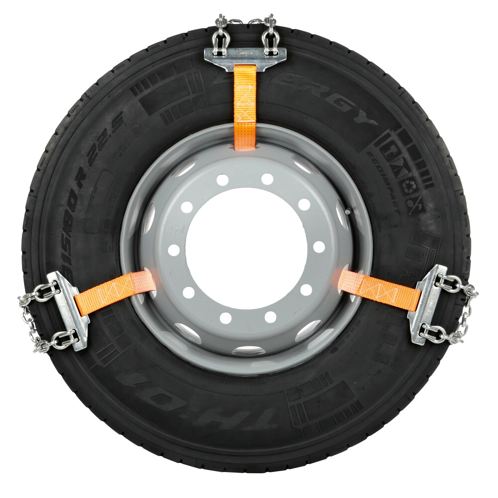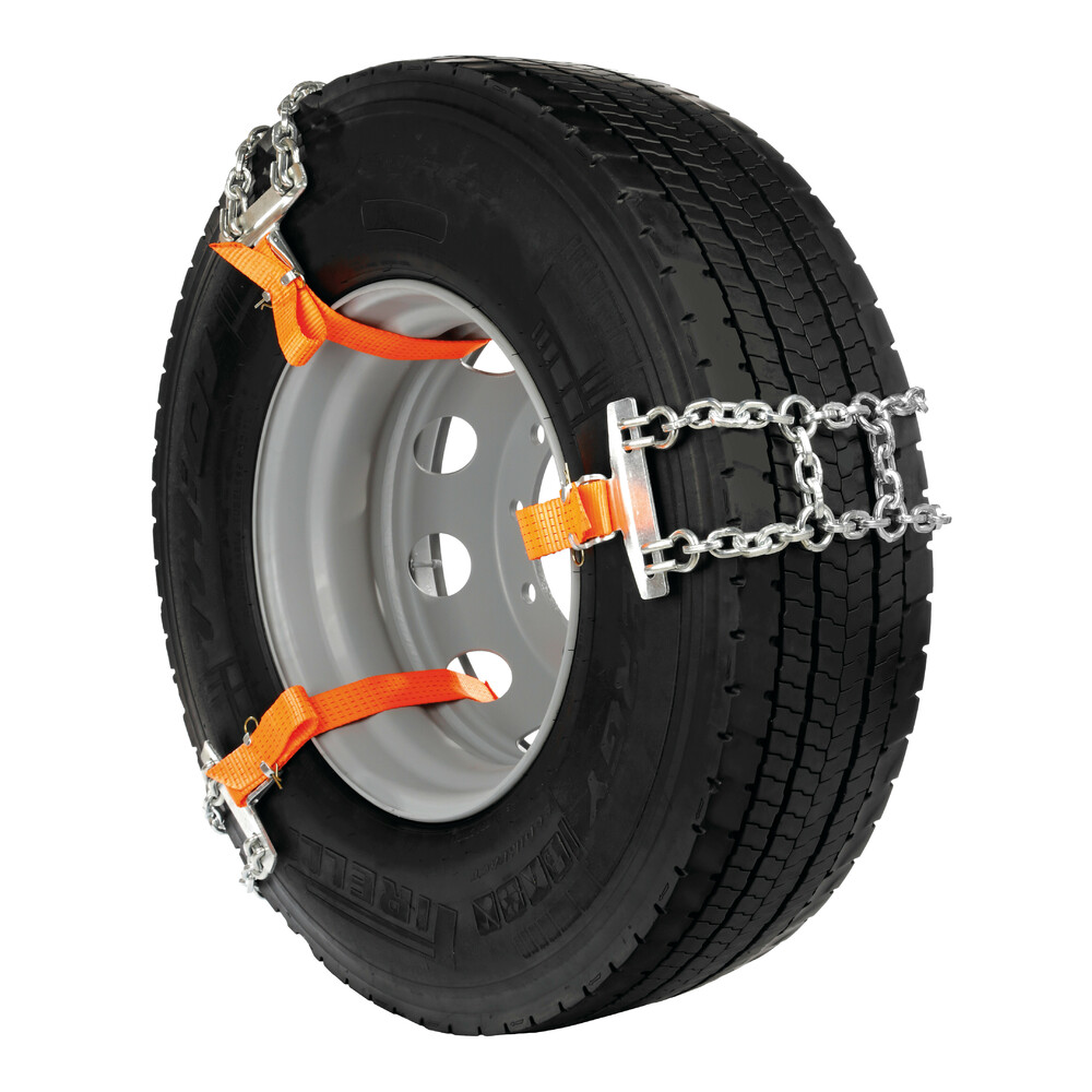 Αλυσίδα φορτηγού, ιταλικής προέλευσης, κατασκευασμένη από γαλβανιζέ σίδερο (ατσάλι, το οποίο έχει προστατευτικό επίστρωμα ψευδαργύρου, που προστατεύει το ατσάλι από την οξείδωση). Διαθέτει 2 σειρές από αλυσίδα σε σχήμα "D" με ενισχυμένους σταυρωτούς συνδέσμους και ιμάντα δέσης με κλιπ (Quick fit belt system), που προσαρμόζεται πάνω στον τροχό εύκολα και με ασφάλεια κατά την οδήγηση σε χιόνι και πάγο. Κατάλληλη αλυσίδα για οχήματα βαρέως τύπου, φορτηγά και SUV.
