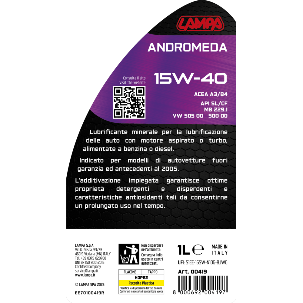 ΛΑΔΙ ΚΙΝΗΤΗΡΑ 15W40 ΟΡΥΚΤΟ ΓΙΑ ΚΙΝΗΤΗΡΕΣ ΒΕΝΖΙΝΗΣ & DIESEL ACEA A3/B4 ANDROMEDA 1LT LAMPA - 1 ΤΕΜ.