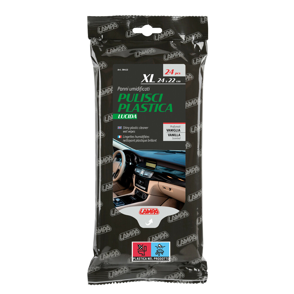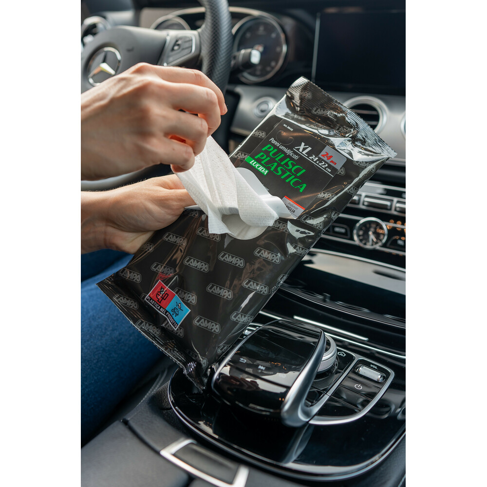 Υγρά μαντηλάκια καθαρισμού πλαστικών επιφανειών με γυαλιστερό φινίρισμα από την εταιρεία LAMPA, ιταλικής προέλευσης.