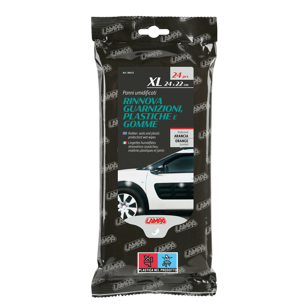 Υγρά μαντηλάκια καθαρισμού λαστιχένιων και πλαστικών επιφανειών από την εταιρεία LAMPA, ιταλικής προέλευσης.