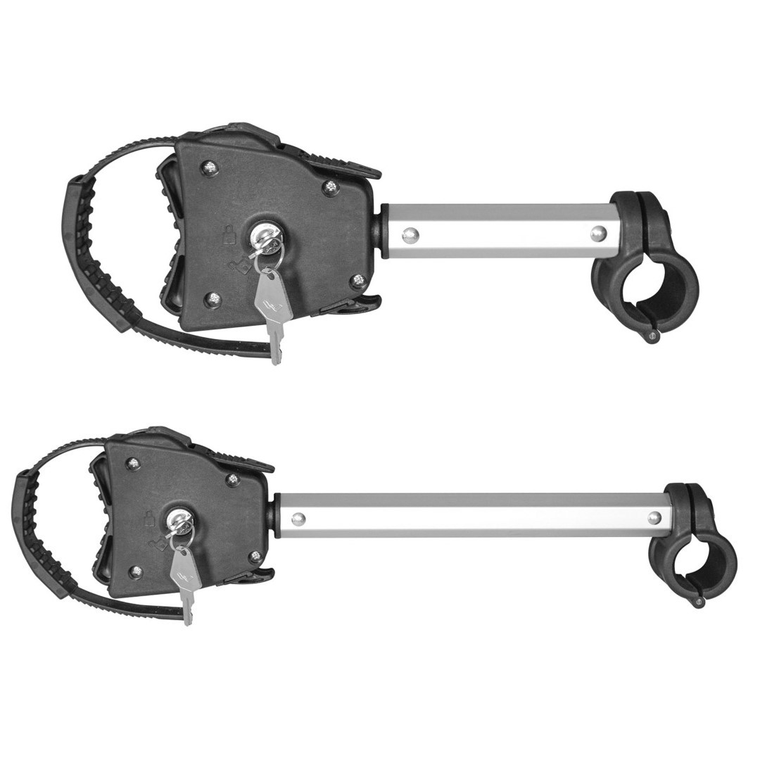 Kit με μπράτσα συγκράτησης για τον σκελετό του ποδηλάτου από την MENABO, 100% ιταλικής προέλευσης και κατασκευής από ατσάλι και πλαστικό, κατάλληλα για τοποθέτηση σε βάσεις ποδηλάτων. Ρυθμιζόμενα με πολλαπλούς περιστρεφόμενους μεντεσέδες, εξοπλισμένα με αντικλεπτικό σύστημα (περιλαμβάνεται κλειδαρια με κλειδί), εξαιρετικά ευέλικτα για να συγκρατούν σταθερά και με ασφάλεια τα ποδήλατα κατά τη μεταφορά τους επάνω στη βάση, προστατεύοντας τα από πιθανή πτώση, κτλ. Εύκολη και γρήγορη προσαρμογή.