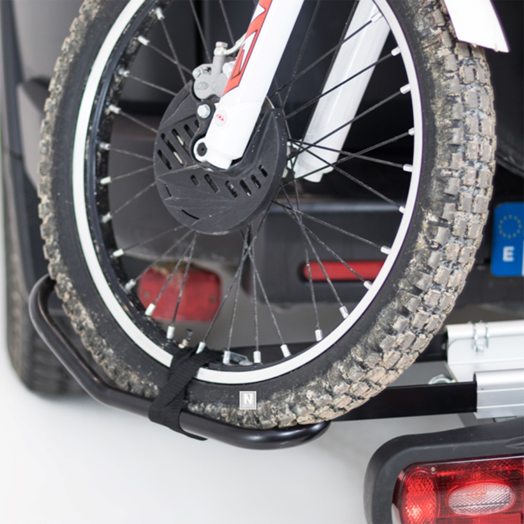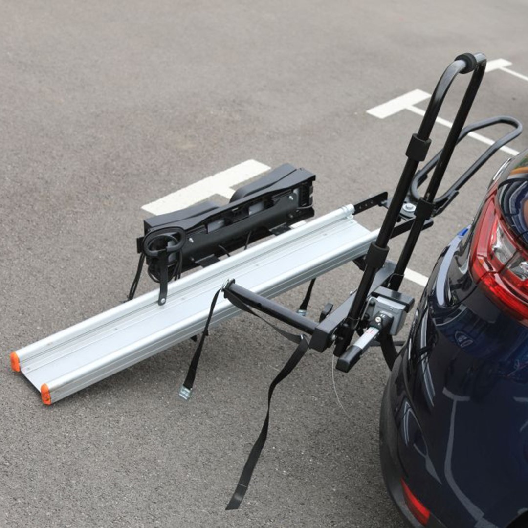 Διαθέτει ειδικό οδηγό (ράγα) με ρυθμιζόμενο σύστημα πλάγιας ανάκλισης για την εύκολη ανάβαση/κατάβαση της μηχανής, ρυθμιζόμενο αντάπτορα για τη στήριξη του μπροστινού τροχού, αντικλεπτικό σύστημα ασφαλείας στο μοχλό δέσης για τη τοποθέτηση της επάνω στον κοτσαδόρο του αυτοκινήτου και 4 ιμάντες με μήκος 120 cm για πρόσδεση, στήριξη και ασφαλή συγκράτηση του δίκυκλου.