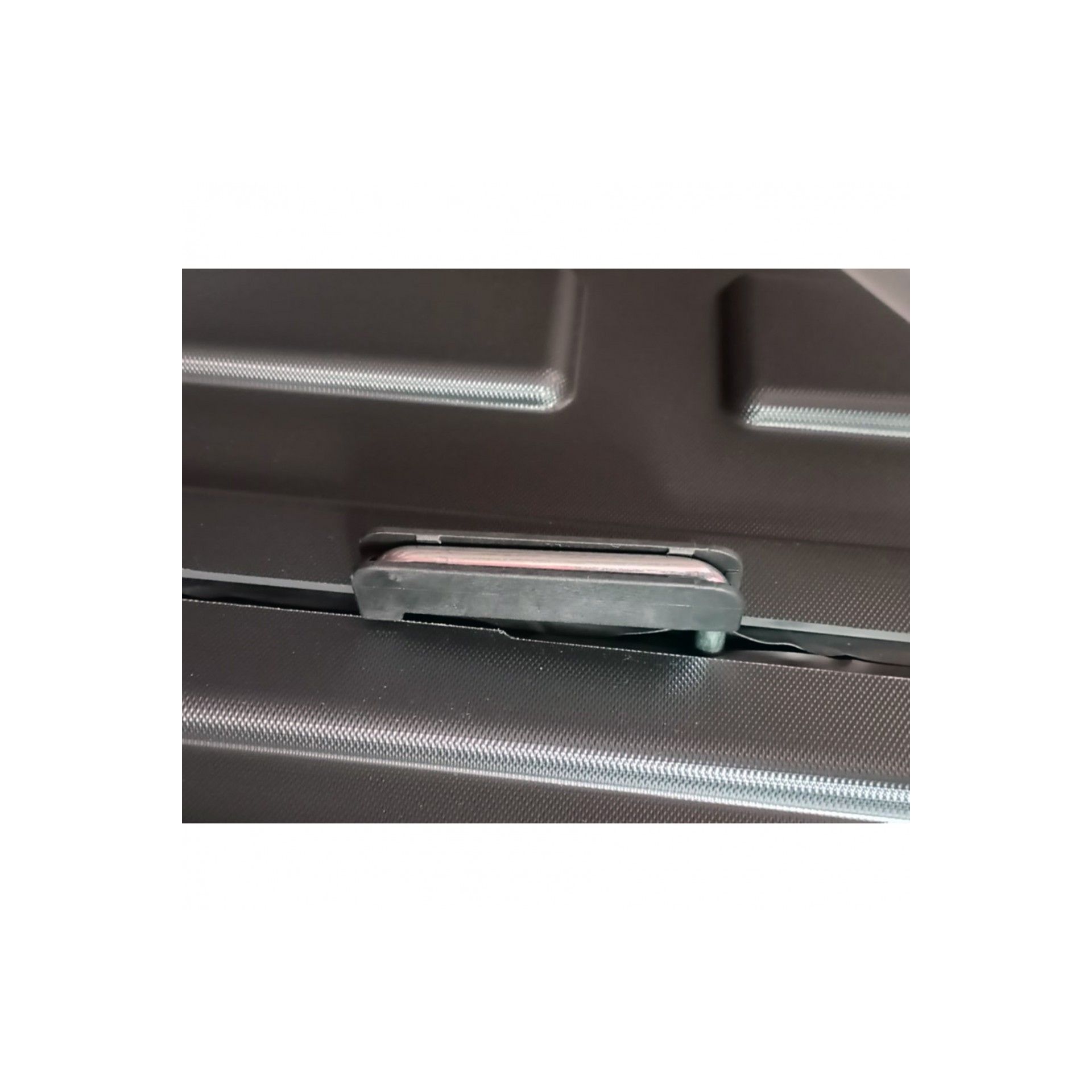 Μπαγκαζιέρα οροφής αυτοκινήτου, ιταλικής προέλευσης, με μαύρη ματ ανάγλυφη υφή, η οποία είναι κατασκευασμένη από πλαστικό ανακυκλώσιμο υλικό προστατευμένο από τις UV υπεριώδης ακτινοβολίες, ανθεκτικό σε υψηλές και χαμηλές θερμοκρασίες. Διαθέτει κεντρικό σύστημα κλειδώματος ασφαλείας, σύστημα ανοίγματος με πλαστικά ψαλίδια, πρόσθετη κουμπωτή ασφάλεια στο μπροστινό μέρος και ειδικές εσοχές για τη καλύτερη εφαρμογή επάνω στις μπάρες.