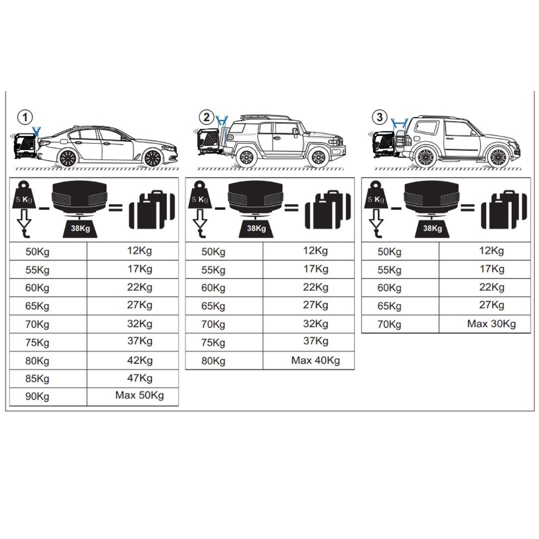 - Μέγιστο βάρος φορτίου: 37 kg για κοτσαδόρους με αντοχή έως 75 kg / 50 kg για κοτσαδόρους με αντοχή έως 90 kg.