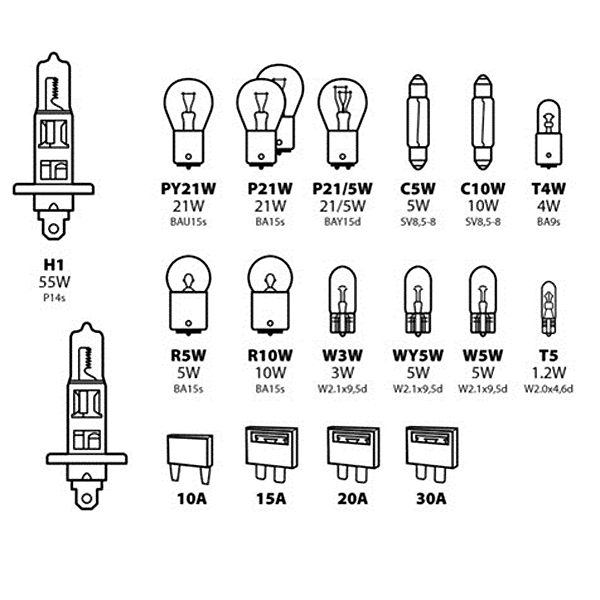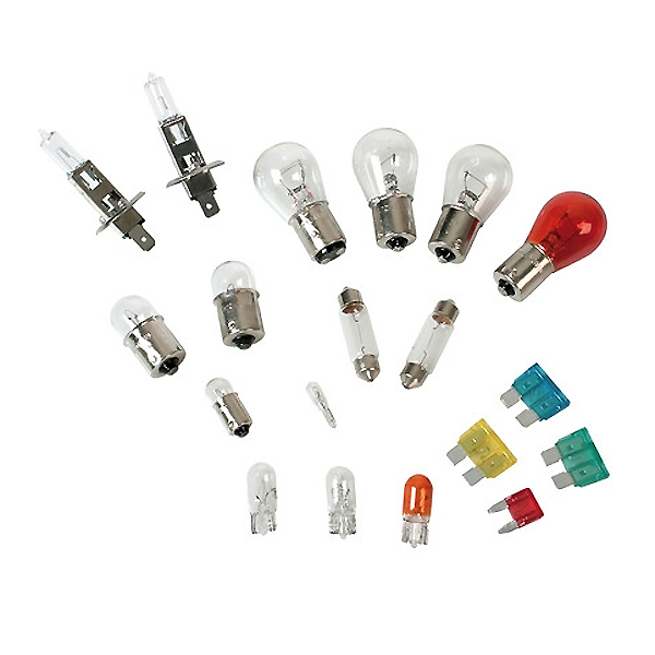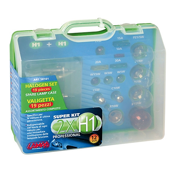 Η1 12V ΑΝΤΑΛΛΑΚΤΙΚΟ ΚΙΤ 19 ΤΕΜΑΧΙΩΝ Περιλαμβάνει 2 λάμπες αλογόνου Η1 και από 1 λάμπα αλογόνου P21W, P21/5W, C5W, R5W, Τ5, W5W, T4W, PY21W, C10W, R10W, W3W, WY5W καθώς επίσης και από 1 ασφάλεια 10Α,15Α,20Α και 30Α. Εγκεκριμένου τύπου.
