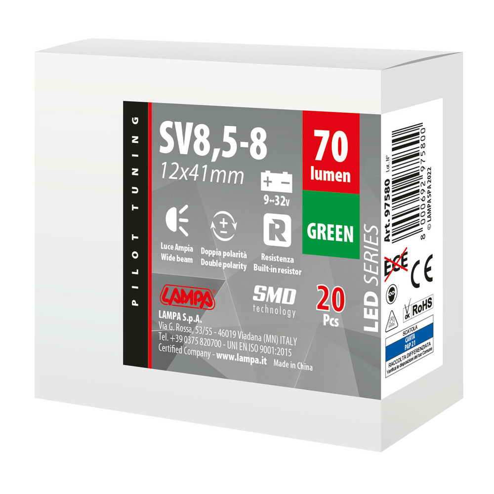 Λαμπάκια πλαφονιέρας 9>32V SV8,5-8 2SMDx1CHIP LED 70lm CAN-BUS 12x41 mm πράσινο σε κουτί, από την εταιρεία LAMPA, ιταλικής προέλευσης.