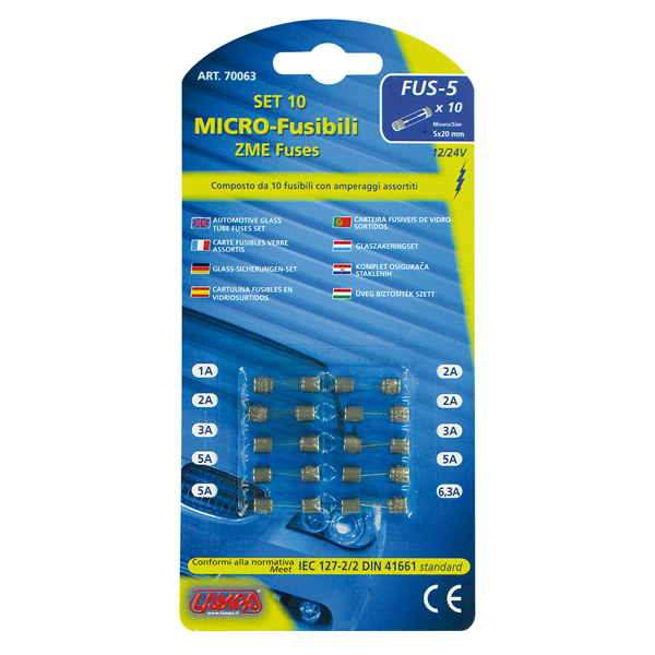 ΑΣΦΑΛΕΙΕΣ ΓΥΑΛΙΝΕΣ ΒΑΚΕΛΙΤΗ FUS-5 ΣΕ ΚΑΡΤΕΛΑ - 10ΤΕΜ. 1x1A - 3x2A - 2x3A - 3x5A - 1x6,3A.