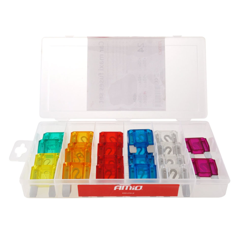 ΑΣΦΑΛΕΙΕΣ MAXI ΔΙΑΦΟΡΕΣ ΣΕ ΚΟΥΤΙ ΑΜΙΟ - 24 ΤΕΜ. Ασφάλειες, από την εταιρεία ΑΜΙΟ, πολωνικής προέλευσης. Τύπος ασφάλειας: MAXI Περιεχόμενα: 20A x 2 30A x 2 40A x 5 50A x 4 60A x 5 80A x 4 100A x 2 Συσκευασία 24 τεμαχίων