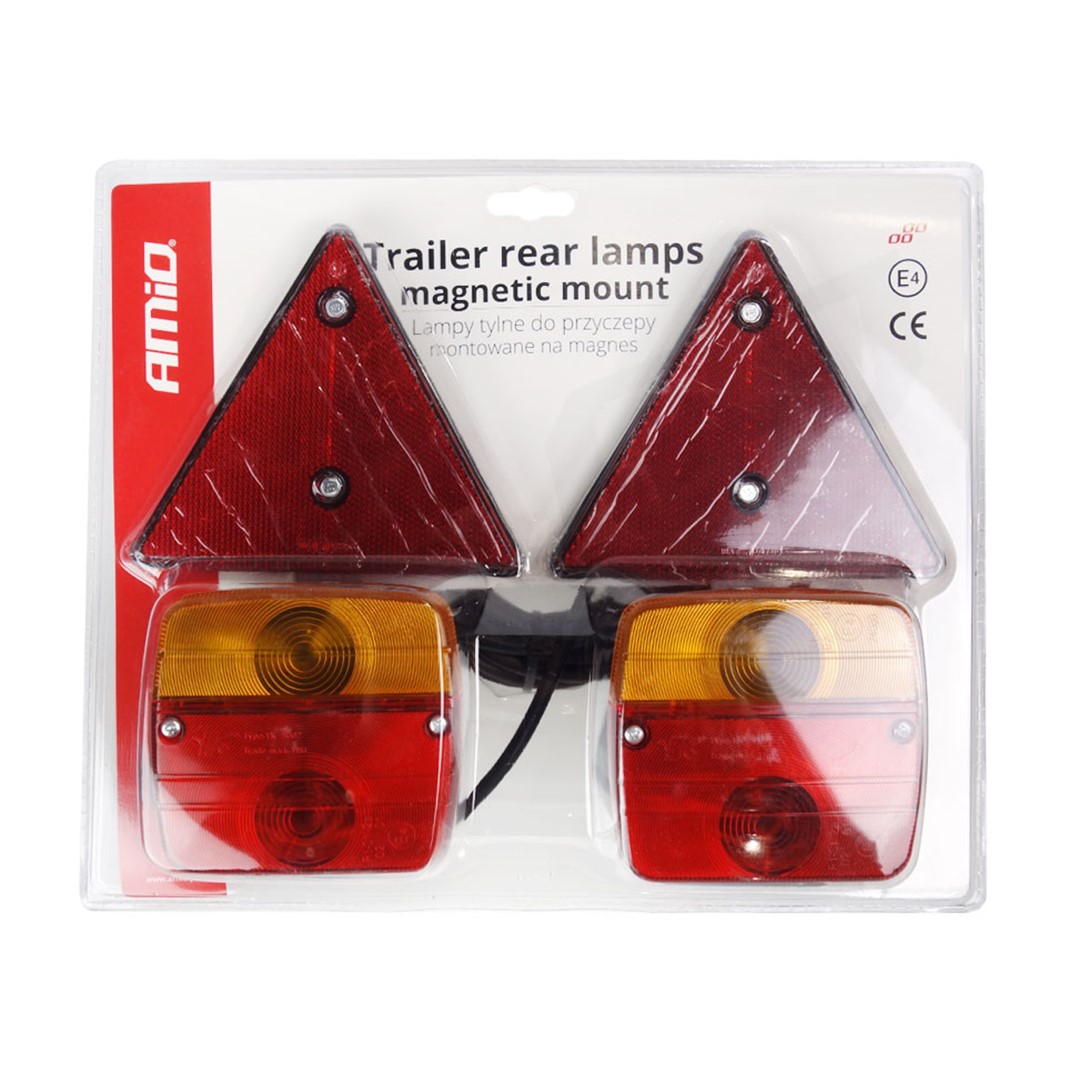 Φανάρια με ανακλαστικά τρίγωνα στο επάνω μέρος για την τοποθέτησή τους σε τρέιλερ, πολωνικής προέλευσης από την εταιρία AMIO. Διαθέτει καλώδιο σύνδεσης 7.5mm με πρίζα 7pin. Είναι μαγνητικά για να τοποθετούνται εύκολα και γρήγορα. Κατάλληλο για οχήματα με τάση 12V.