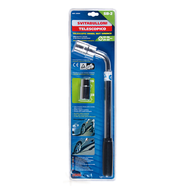 Τηλεσκοπικό μπουλονόκλειδο SB-2 με πλαστική λαβή, ιταλικής προέλευσης από την εταιρία Lampa. Χρήσιμο εργαλείο για να βιδώνετε/ ξεβιδώνετε τα μπουλόνια του τροχού σας εύκολα και αποτελεσματικά. Κατάλληλο μπουλονόκλειδο για μπουλόνια με κεφαλή (κλειδί) 17, 19,21, 23mm.