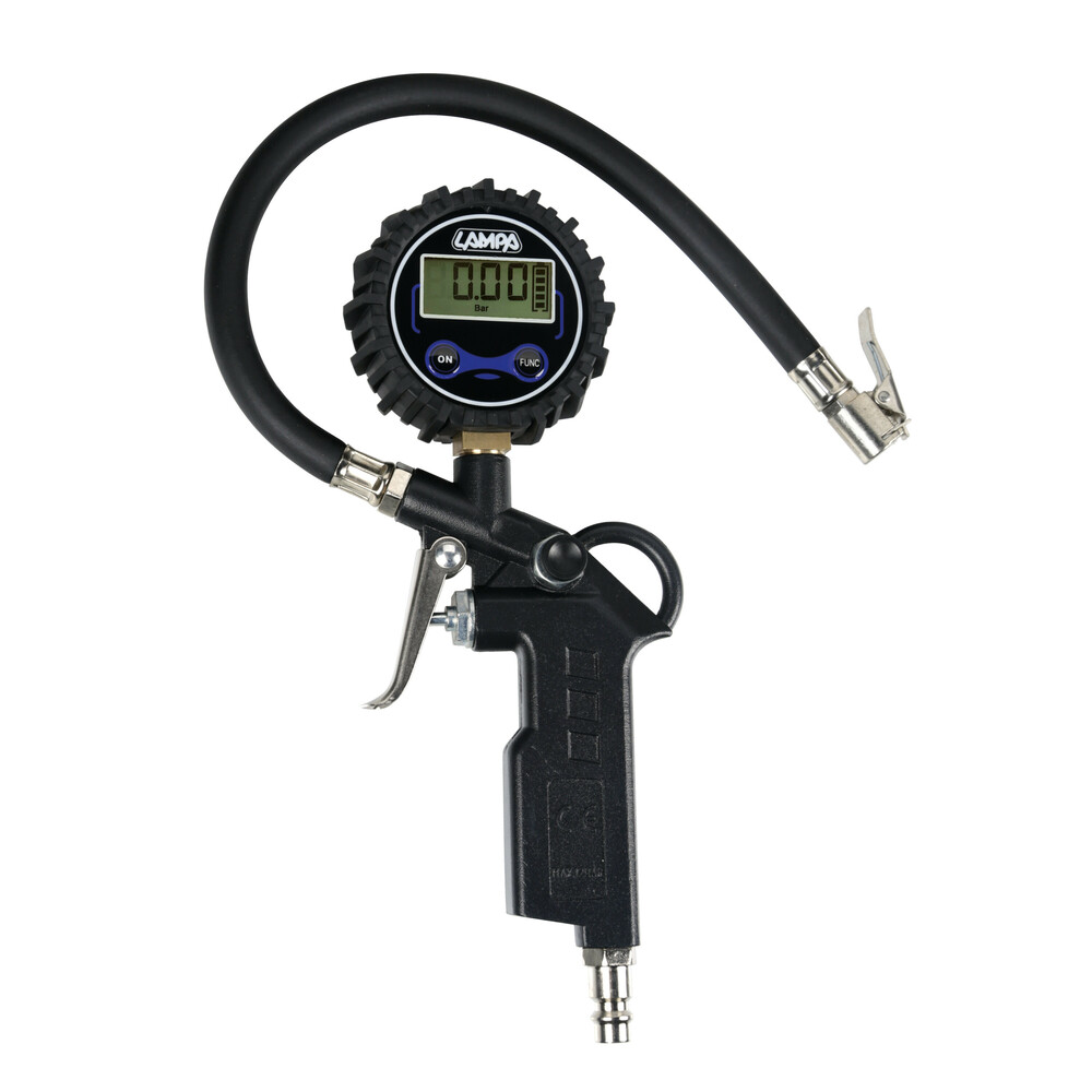 Μετρητής πίεσης αέρα ελαστικών με πιστόλι και ψγφιακή ένδειξη, απο την εταιρεία LAMPA, ιταλικής προέλευσης. Μπορεί να χρησιμοποιηθεί για το φούσκωμα / ξεφούσκωμα των ελαστικών και για τη μέτρηση της πίεσης των ελαστικών.