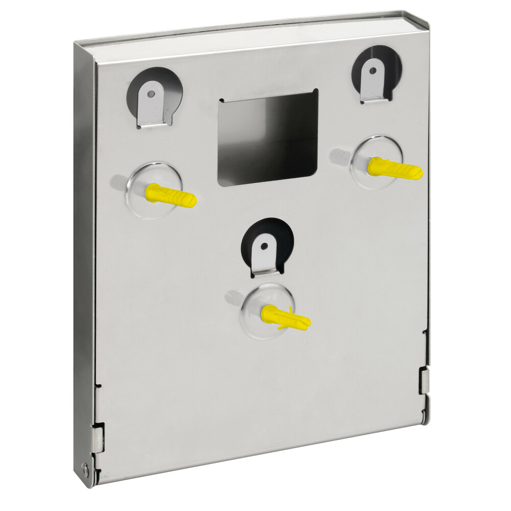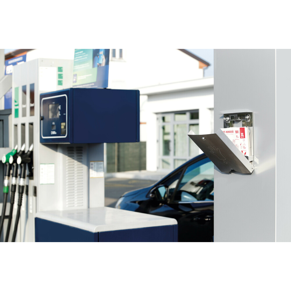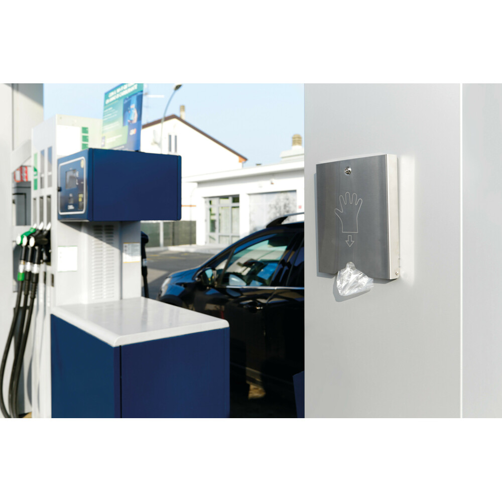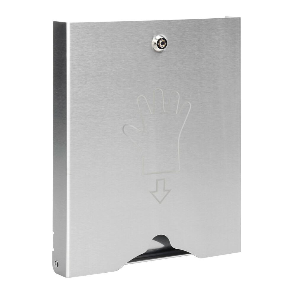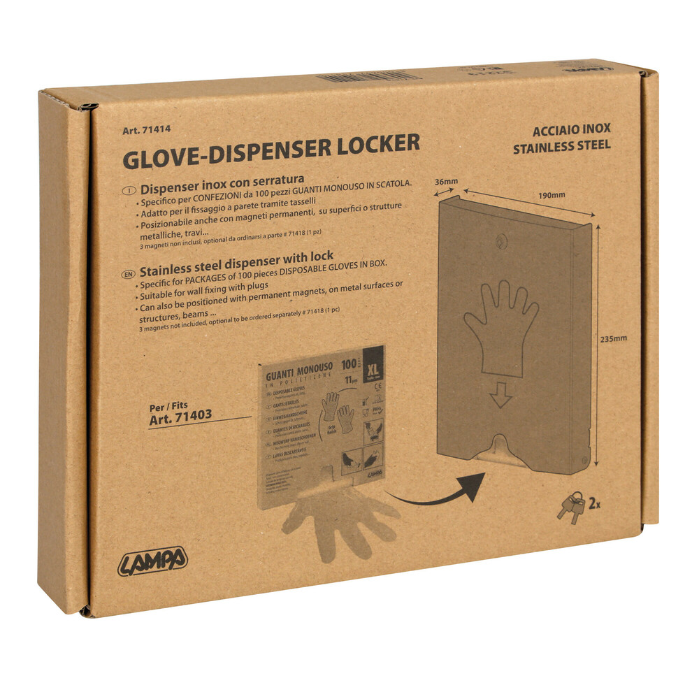 Κουτί μεταλλικό με κλειδί, βιδωτό στο τοίχο, για γάντια μιας χρήσης (τα γάντια πωλούνται ξεχωριστά) απο την εταιρεία LAMPA, ιταλικής προέλευσης. Κατάλληλο για στερέωση σε τοίχο με βύσματα. Μπορεί επίσης να τοποθετηθεί με μόνιμους μαγνήτες, σε μεταλλικές επιφάνειες ή κατασκευές, δοκούς κ.α.