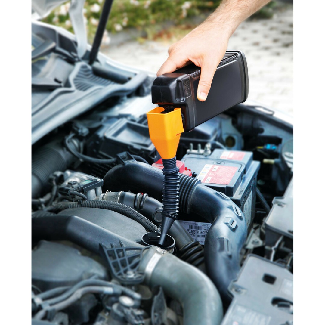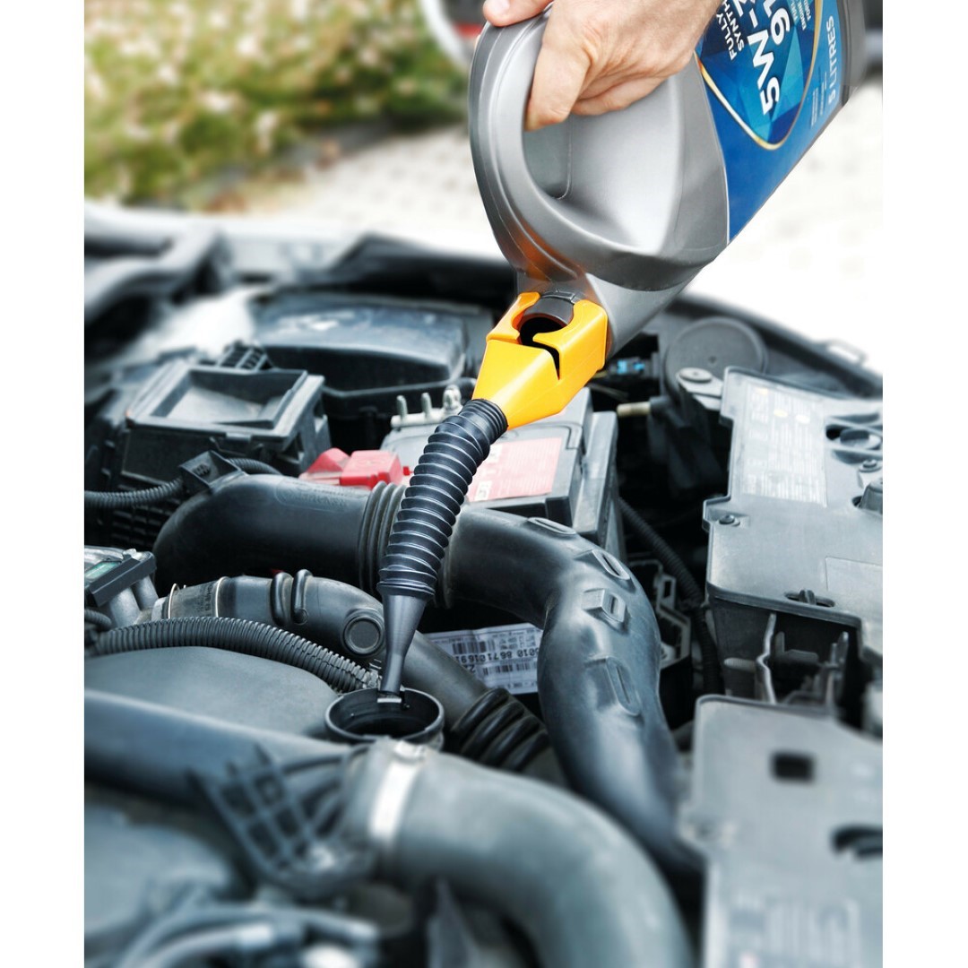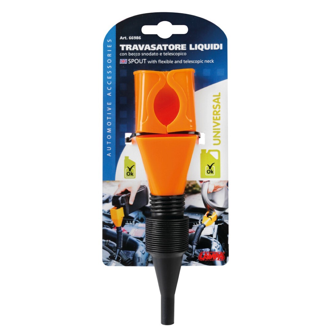 Ειδικό πλαστικό στόμιο με υποδοχή για μπουκάλια λαδιού με εύκαμπτο ελαστικό σπιράλ, ιταλικής προέλευσης από την εταιρία Lampa. Κατάλληλο προϊόν για να συμπληρώνετε υγρά καυσίμων ή λάδια με ασφάλεια στον κινητήρα κ.α., χωρίς να υπάρχει διαρροή. Με εύκαμπτο και ελαστικό στόμιο για να παίρνει την κλίση που θέλετε κατά την μεταφορά υγρών. Το στόμιο διαθέτει ειδική εγκοπή για τοποθέτηση του μπουκαλιού με διάμετρο στομίου 20-45mm. Το σπιράλ είναι τηλεσκοπικό και επεκτείνεται από 9 cm σε 18 cm.