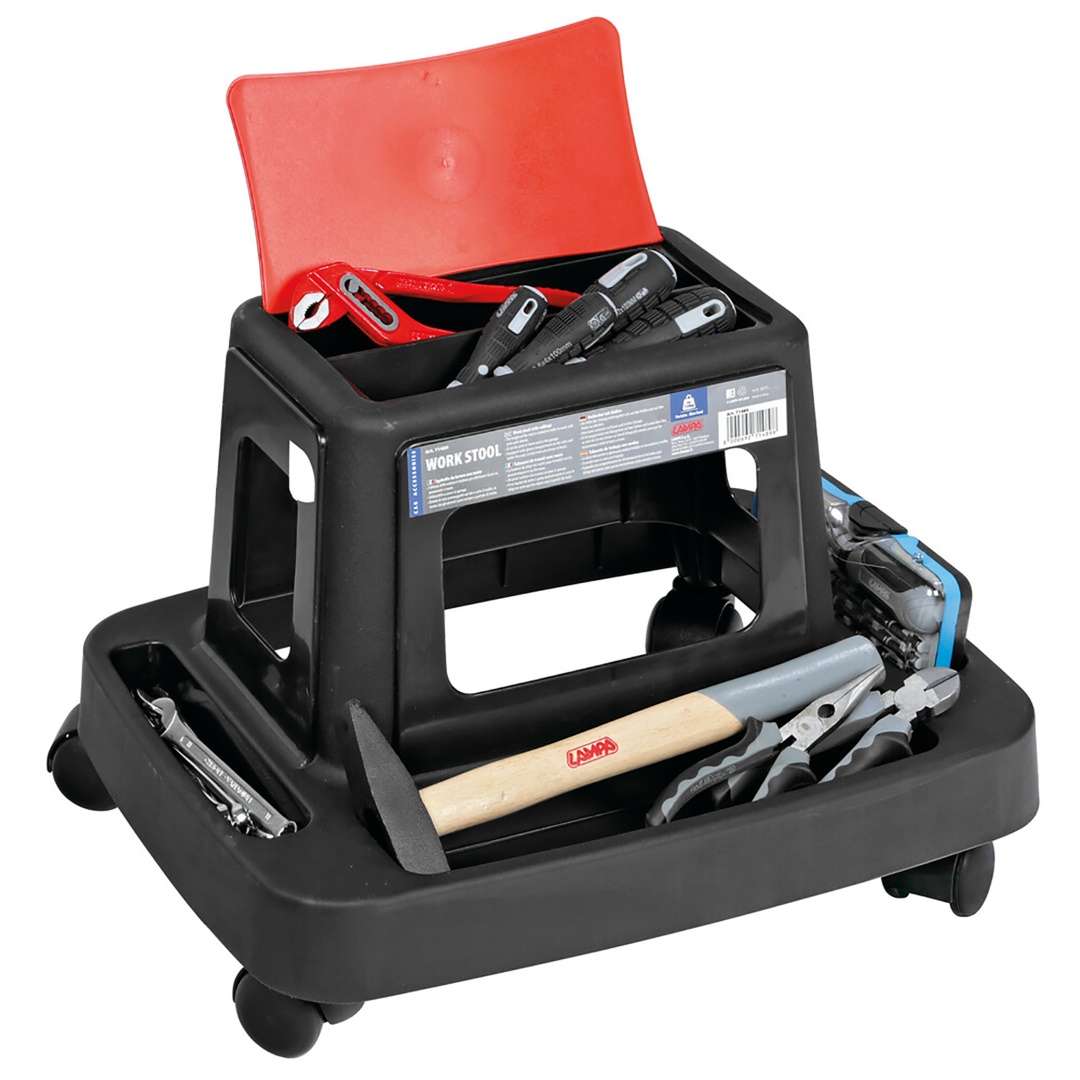 Φορητό σκαμπό με 4 ροδάκια και θέσεις περιμετρικά για τοποθέτηση εργαλείων, ιταλικής προέλευσης της εταιρίας Lampa. Διαθέτει ντουλάπι αποθήκευσης μικροπραγμάτων και εργαλείων στο πάνω μέρος του σκαμπό. Ιδανικό προιόν για να εξοπλίσετε το συνεργείο, το βουλκανιζατέρ, το γκαράζ, ακόμη και για οικιακή χρήση. Είναι εύχρηστο και δεν απαιτεί εργαλεία για την συναρμολογήσή του.