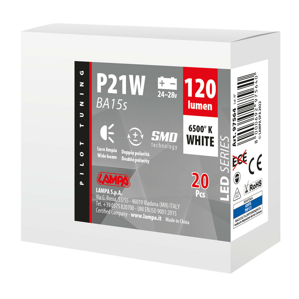P21W BA15s 24/28V 8SMDx1CHIP LED 120lm ΛΕΥΚΟ ΚΟΥΤΙ LAMPA - 20 ΤΕΜ. P21W BA15s 24/28V 8SMDx1CHIP LED 120lm λευκό σε κουτί, από την εταιρεία LAMPA, ιταλικής προέλευσης. -Διαστάσεις: 18,5x34,5 mm. Συσκευασία 20 τεμαχίων