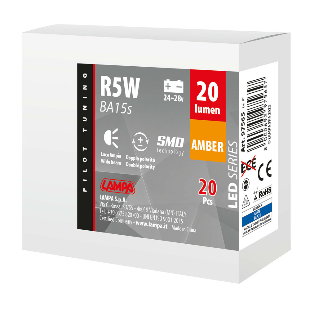 R5W BA15s 24/28V 6SMDX1CHIP LED 20lm ΠΟΡΤΟΚΑΛΙ ΚΟΥΤΙ LAMPA - 20 ΤΕΜ. R5W BA15s 24/28V 6SMDX1CHIP LED 20lm πορτοκαλί σε κουτί, από την εταιρεία LAMPA, ιταλικής προέλευσης. -Διαστάσεις: 18,8 x 32,7 mm. Συσκευασία 20 τεμαχίων