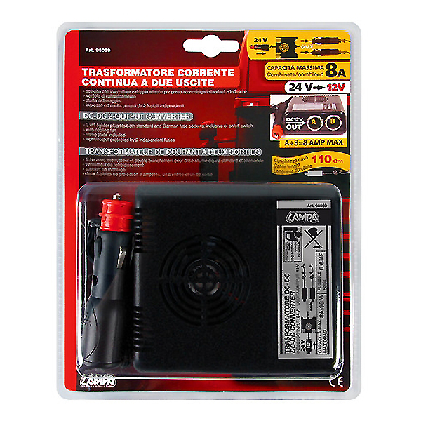 Μετατροπέας 24>12V 8A Tαιριάζει τόσο στα τυποποιημένα όσο και στις πρίζες γερμανικού τύπου, Συμπεριλαμβάνεται ο διακόπτης on/off. Με ανεμιστήρα ψύξης. Καλώδιο 110cm. Η είσοδος/έξοδος προστατατεύονται από 2 ανεξάρτητες ασφάλειες.