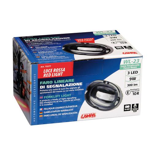 Προβολέας ιταλικής προέλευσης από την LAMPA, με 3 led και μεταλλική βάση στήριξης. Ιδανικό προιόν για την τοποθέτησή του σε περονοφόρο ανυψωτικό όχημα (κλάρκ) για να διατηρείται η κατάλληλη απόσταση ασφαλείας ενώ το όχημα βρίσκεται σε λειτουργία. Ο φωτισμός του προβολέα είναι σε κόκκινο χρώμα ένω είναι κατάλληλος για οχήματα με τάση 10-80V. Ο τύπος φωτισμού είναι κατευθυντικός (focus beam) που βοηθά στην εξάλειψη των σκιών και των σκοτεινών γωνιών (νεκρά σημεία), καθώς η ακτίνα του φωτός εκτείνεται σε μεγάλο μήκος (καρφί).
