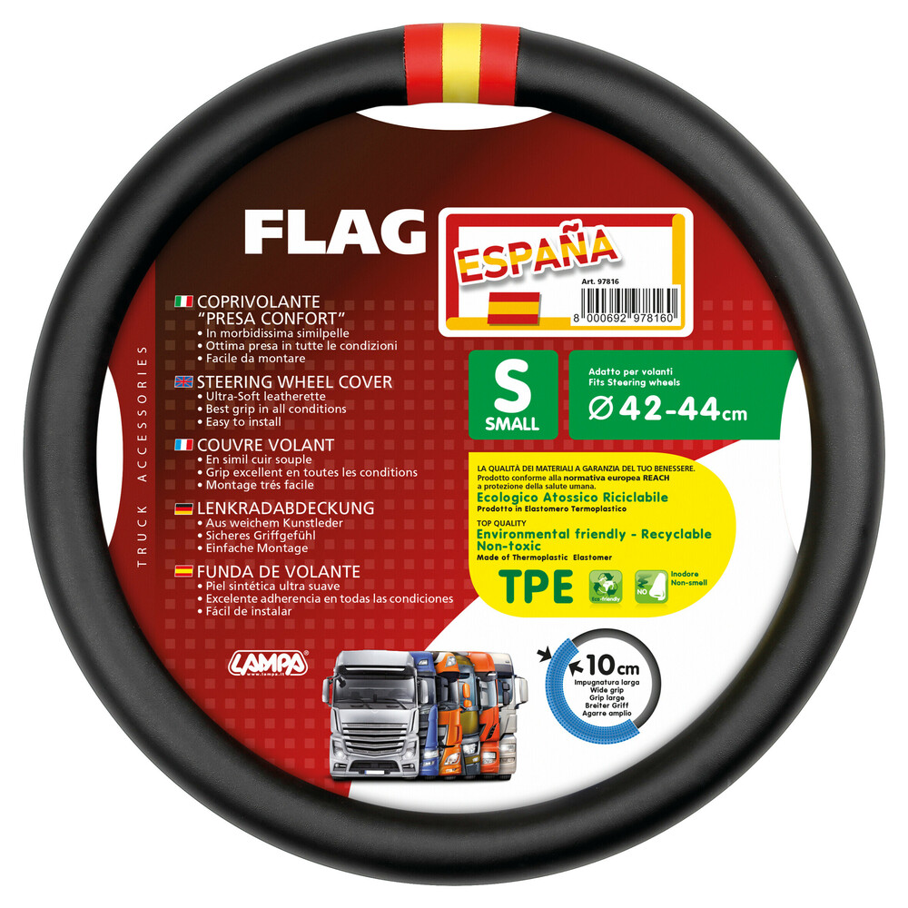Κάλυμμα τιμονιού φορτηγού με την σημαία της Ισπανίας από δερματίνη σε μαύρο χρώμα, μέγεθος Small, απο την εταιρεία LAMPA, ιταλικής προέλευσης.