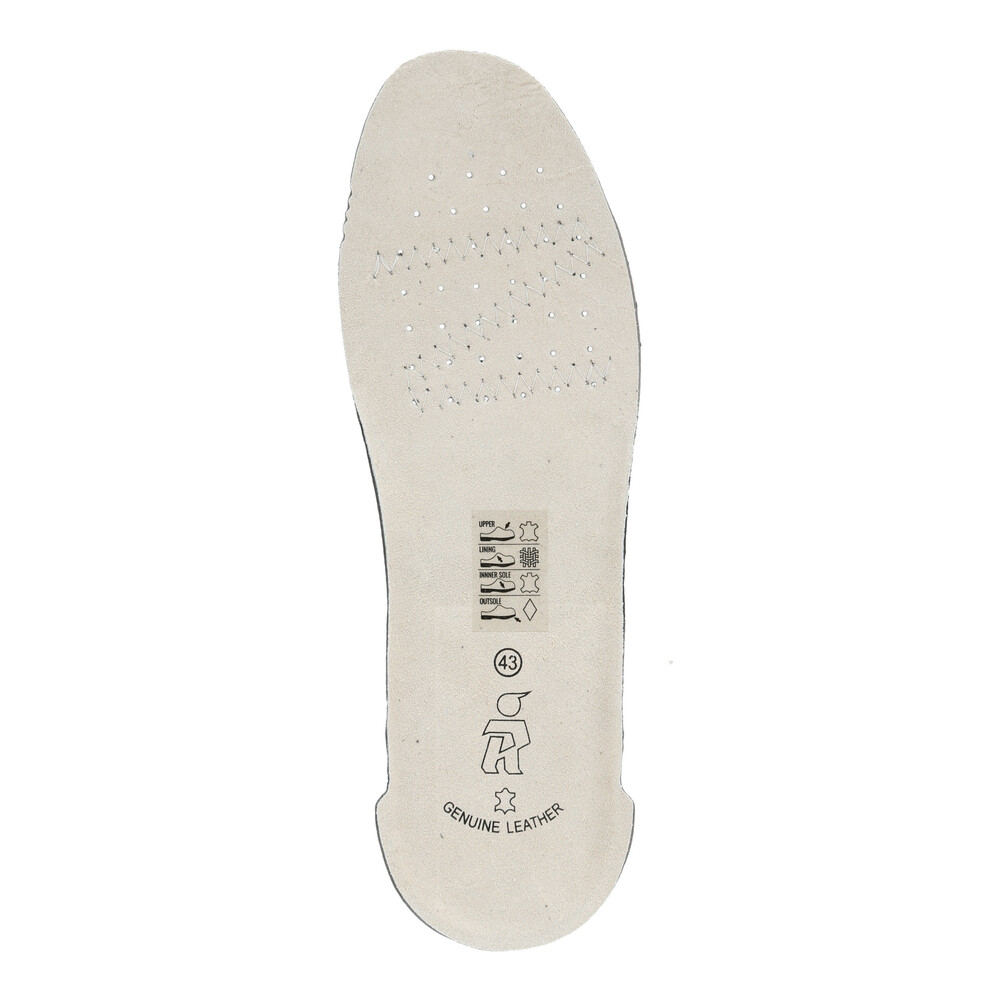 Αποσπώμενος πάτος: Σύνθεση από α) EVA (Ethylene Vinyl Acetate) αφρώδες υλικό, πολύ ελαφρύ για να μην προσθέτει βάρος, μαλακό και εύκαμπτο για άνεση, καθώς προσαρμόζεται στο σχήμα του ποδιού, κατάλληλο για να απορροφά τους κραδασμούς και να μειώνει την καταπόνηση, που δέχονται τα πόδια και οι αρθρώσεις κατά τη διάρκεια του βαδίσματος ή της ορθοστασίας με β) επένδυση από σουέτ δέρμα (suede) για απαλή και βελούδινη υφή, που προσφέρει αίσθηση πολυτέλειας και ποιότητας στο εσωτερικό του παπουτσιού και κατάλληλη απορρόφηση της υγρασίας.