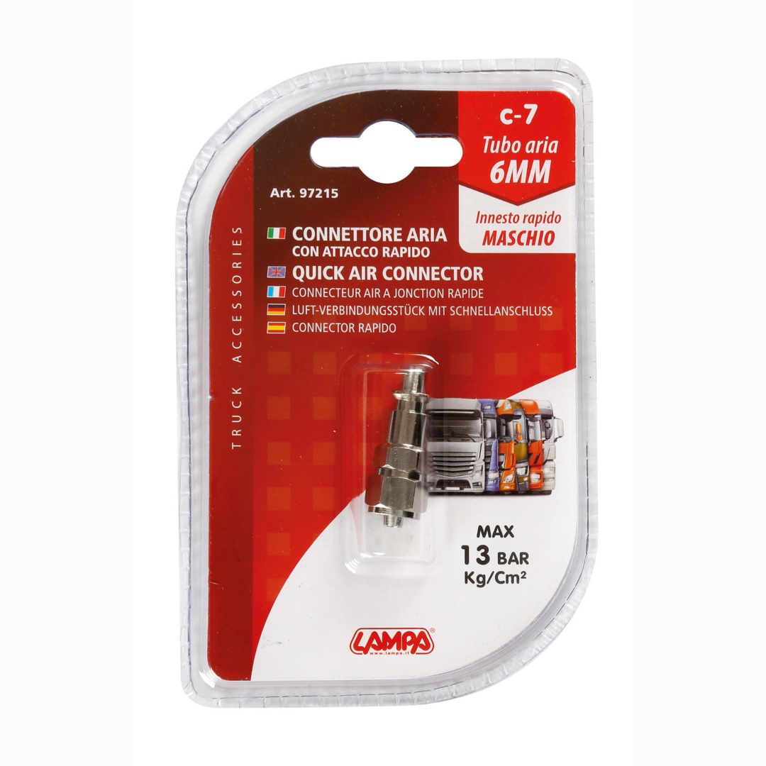 Σύνδεσμος αρσενικός από την εταιρία Lampa, ιταλικής προέλευσης, κατάλληλος για τοποθέτηση στην ήδη υπάρχουσα υποδοχή της καμπίνας του φορτηγού, συνδέοντας πιστόλι αέρα για τον αποτελεσματικό καθαρισμό του εσωτερικού χώρου του οχήματος από την σκόνη και την βρωμιά. Ιδανικό αξεσουάρ για φορτηγά και νταλίκες.